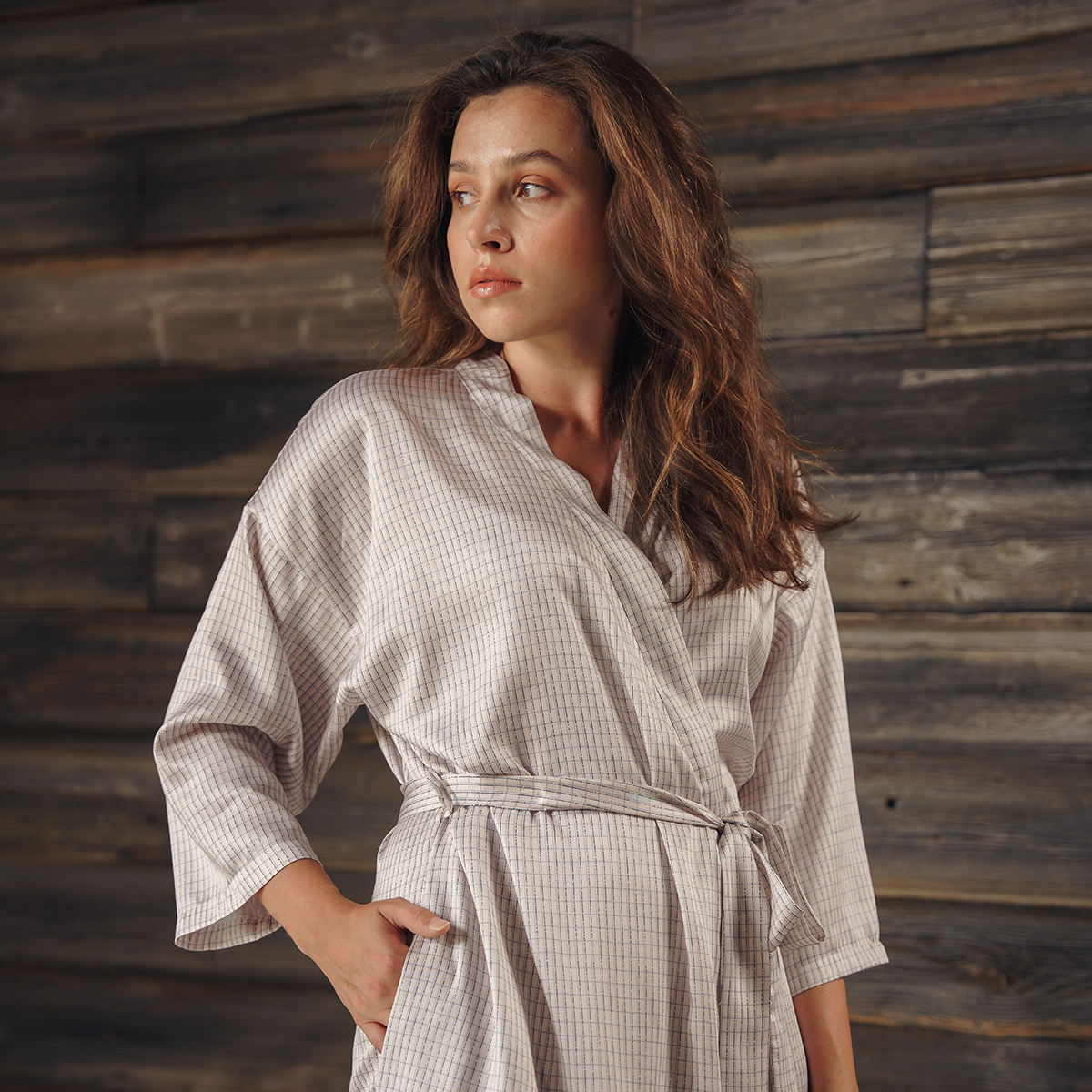 Модель: халат-кимоно, завязывается поясом на запах, имеет внутренние завязки и карманы в швах