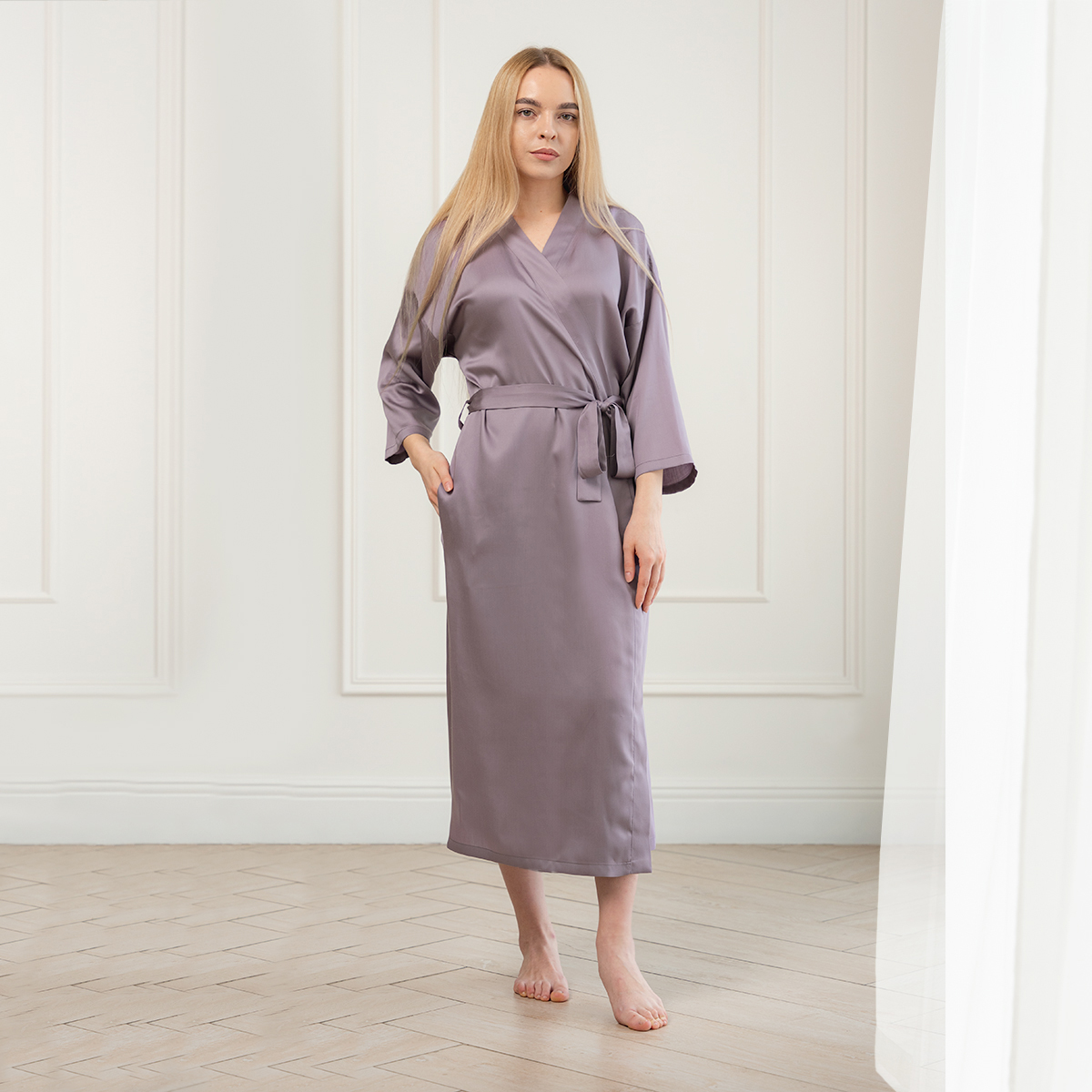 Модель: халат-кимоно, завязывается поясом на запах, имеет внутренние завязки и карманы в швах