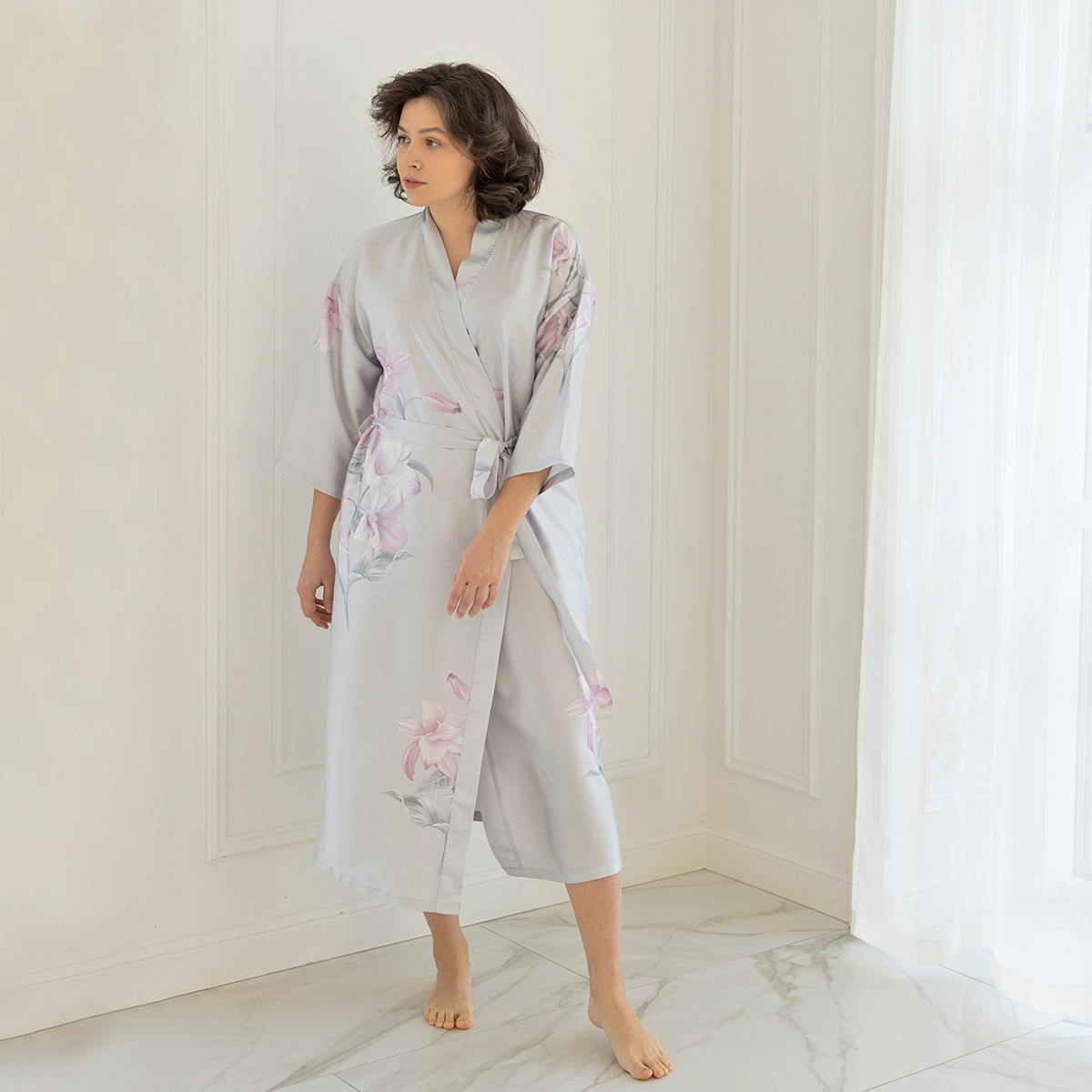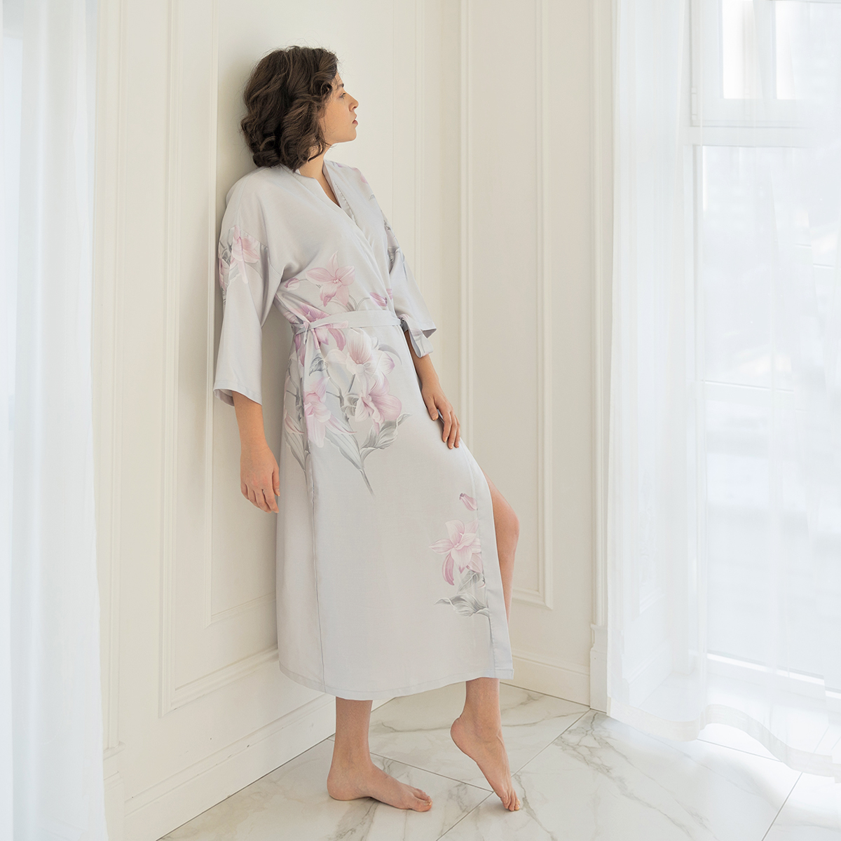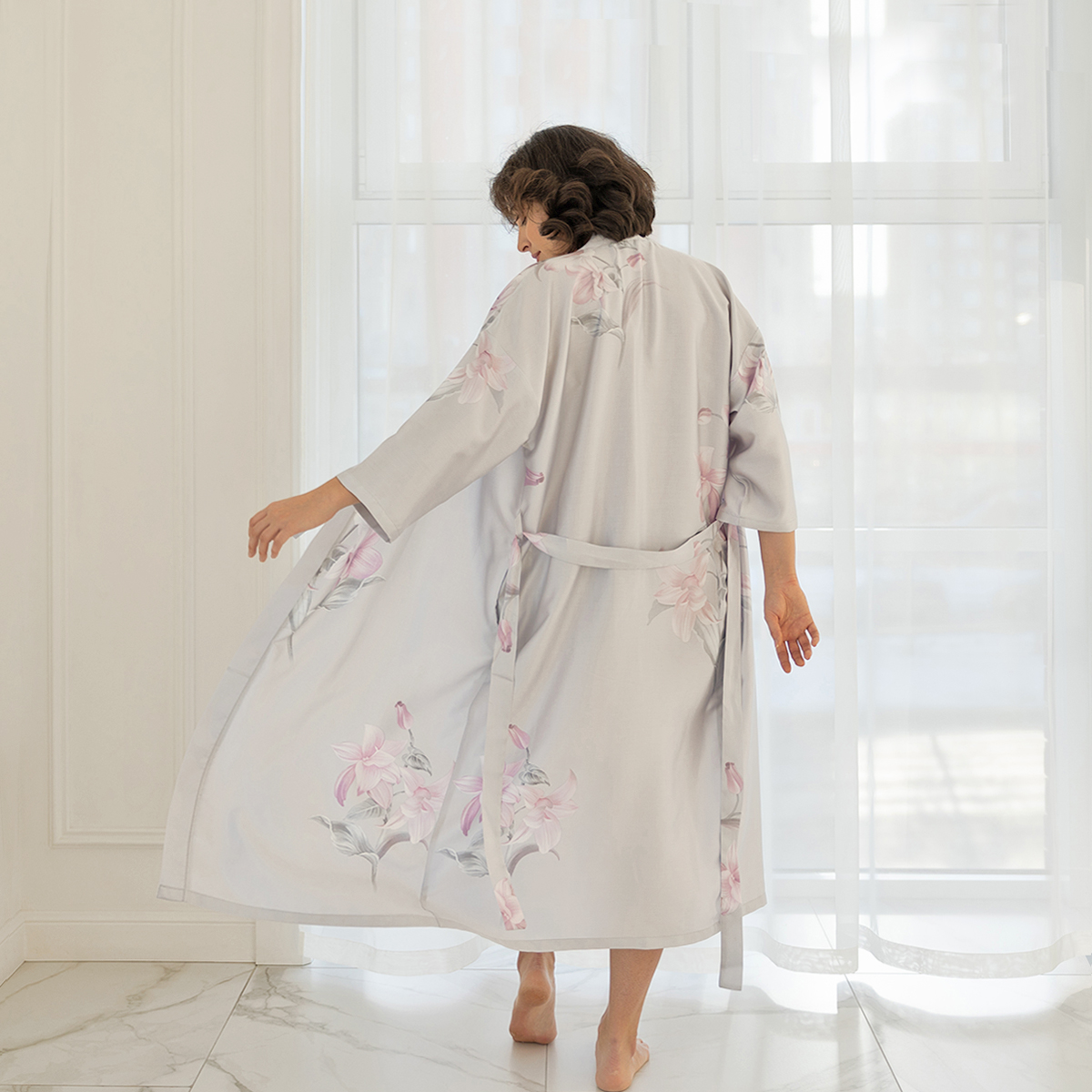 Модель: халат-кимоно, завязывается поясом на запах, имеет внутренние завязки и карманы в швах