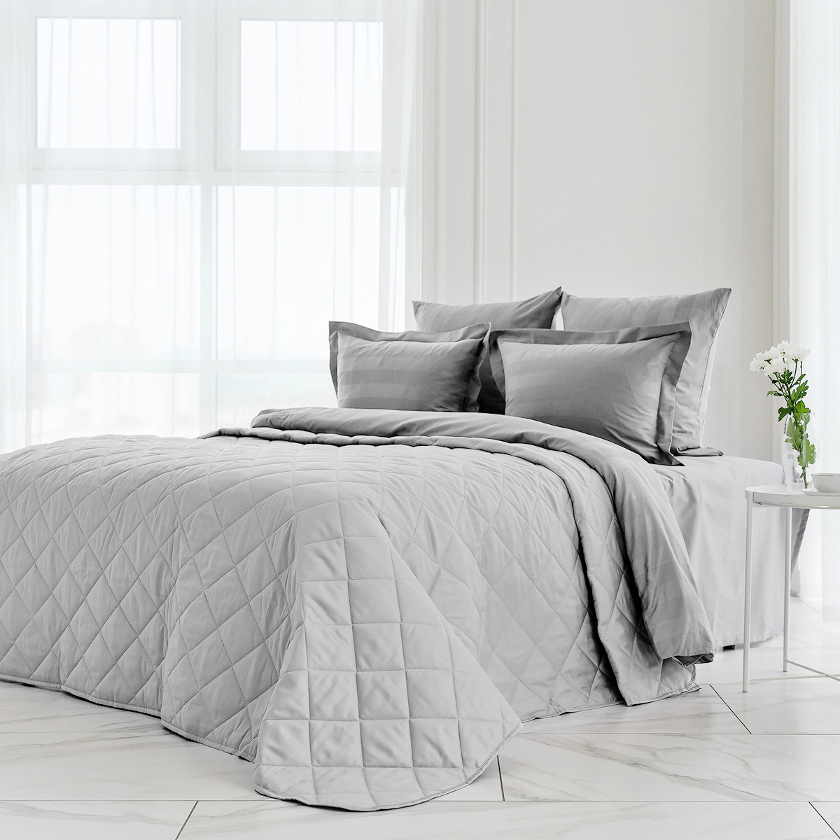 Удобное решение для оформления интерьера в едином стиле - покрывала выполнены в тех же расцветках и из той же ткани, что и однотонное постельное белье La Prima.