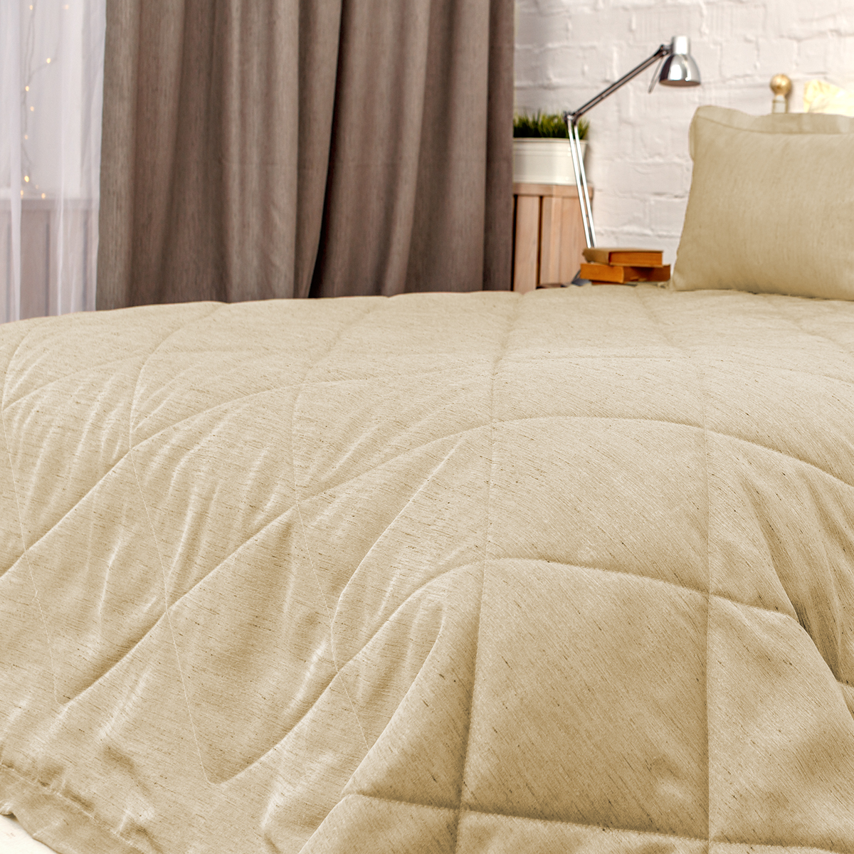 В комплект входит: стеганное покрывало на подкладе размер 240*260 см и 2 декоративные наволочки 50х70 см на молнии. Наволочки с четырех сторон декорированы ушками шириной 4 см.