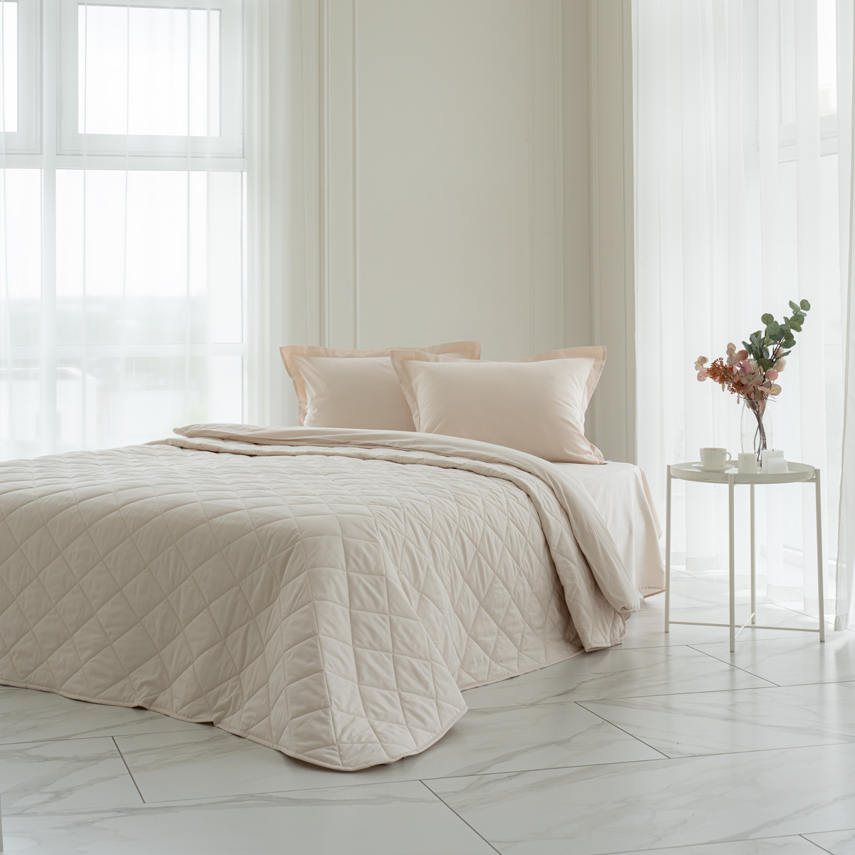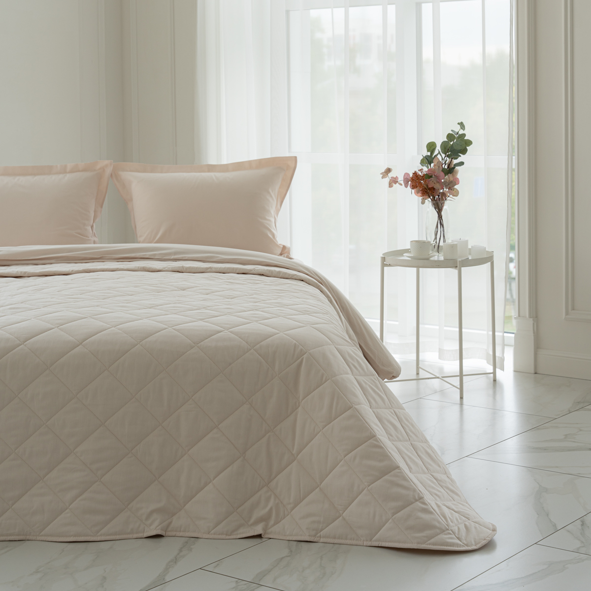 - хлопковое покрывало на кровать с закругленным уголком, практичной окантовкой по периметру изделия и стильной стежкой в виде ромбов;