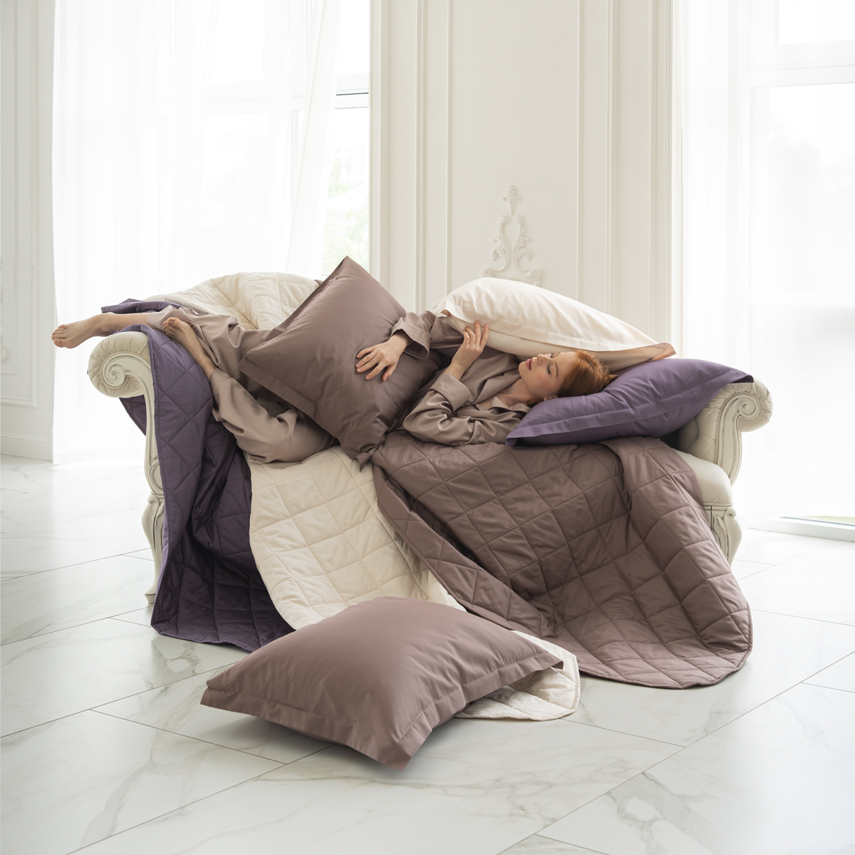 Удобное решение для оформления интерьера в едином стиле - покрывала выполнены в тех же расцветках и из той же ткани, что и однотонное постельное белье La Prima.