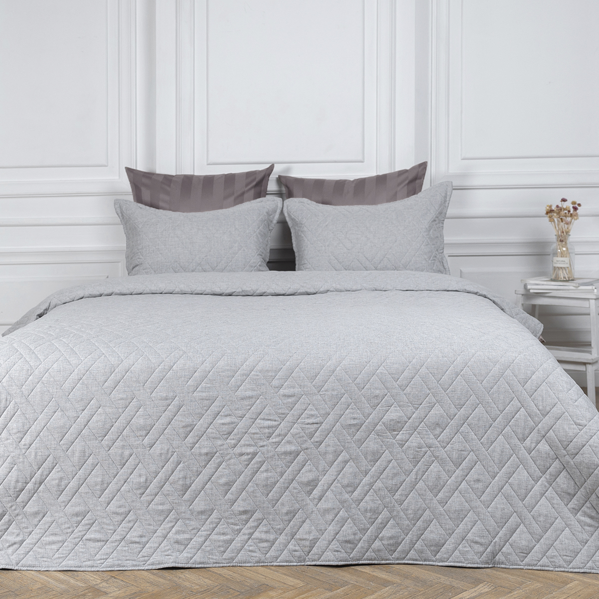 В комплект входит: покрывало на кровать 220x240 см и декоративные стеганые наволочки 50x70 см с ушками – 2шт. Состав: 60% вискозы и 40% хлопка, обеспечивает нежное прикосновение и комфортный сон. Покрывало имеет тактильно приятную Soft Touch фактуру и матовую поверхность для максимального комфорта. Не скользит, идеально принимает форму кровати.