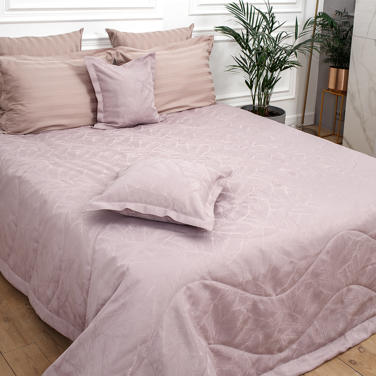 В комплект входит: стеганное покрывало на подкладе размер 240*260 см и 2 декоративные наволочки 45х45 см на молнии. Наволочки с четырех сторон декорированы ушками шириной 4 см.
