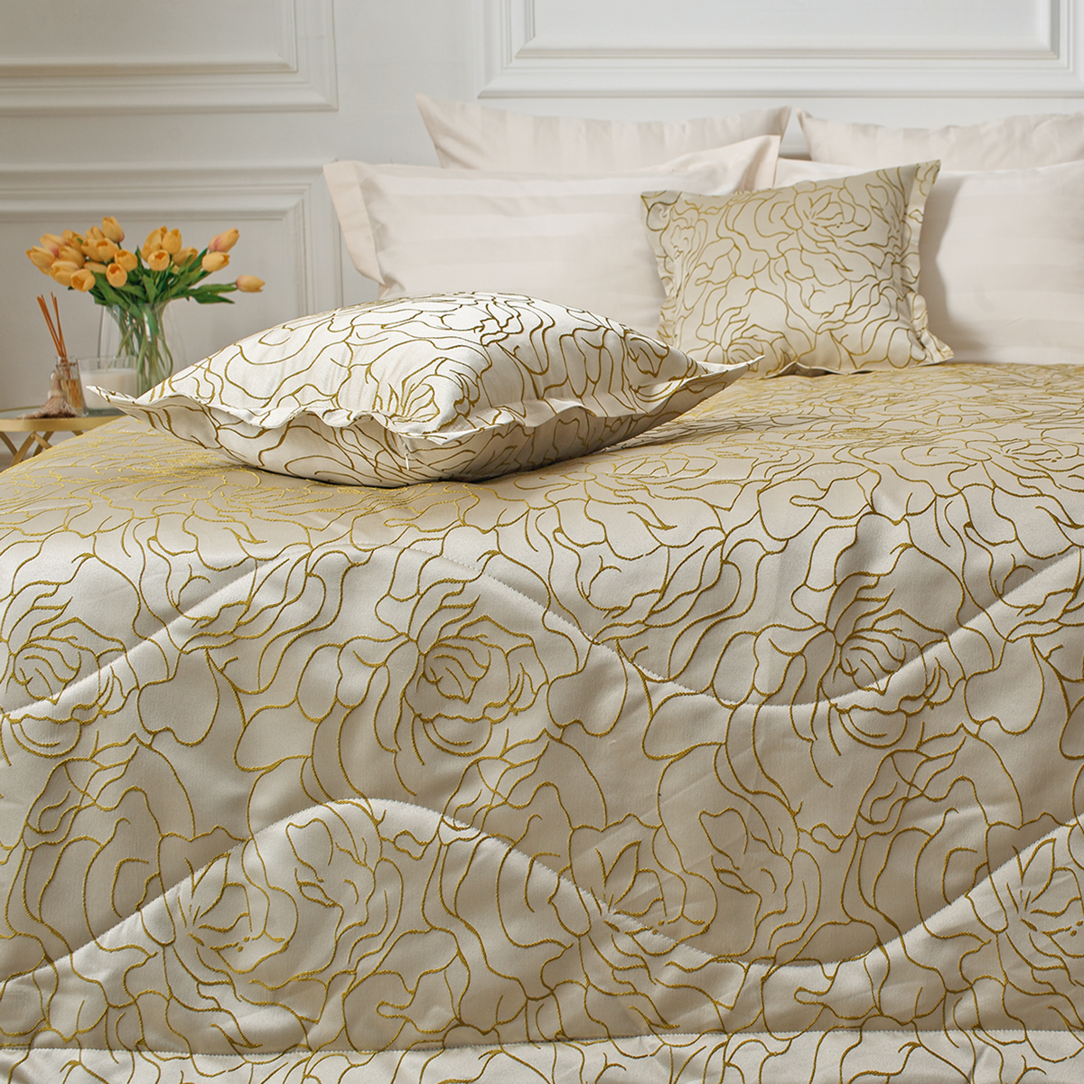 Селеста - базовая коллекция. Замысловатые линии, изящно переплетающиеся в оригинальный узор, элегантный сдержанный блеск жаккардовой ткани, сочные и одновременно универсальные оттенки делают эту коллекцию настоящим украшением любой спальни.