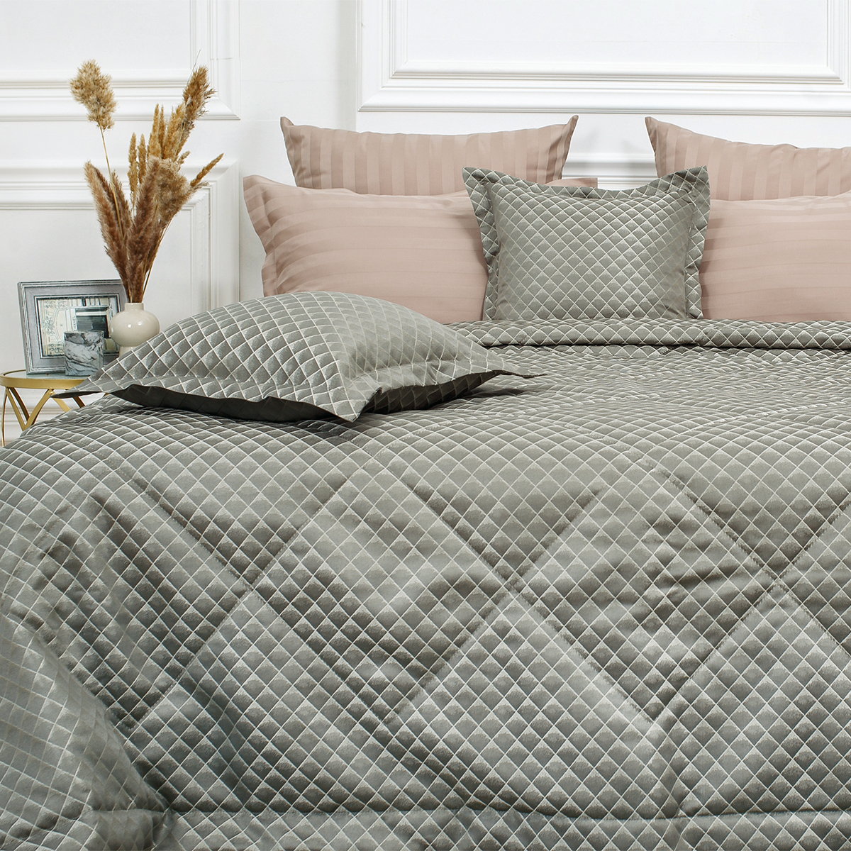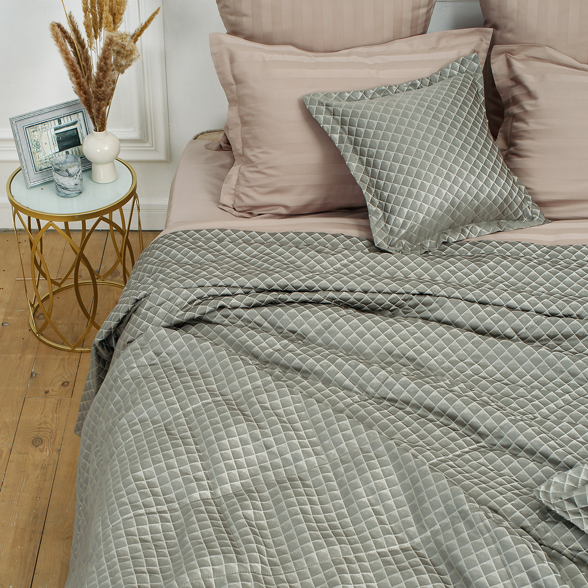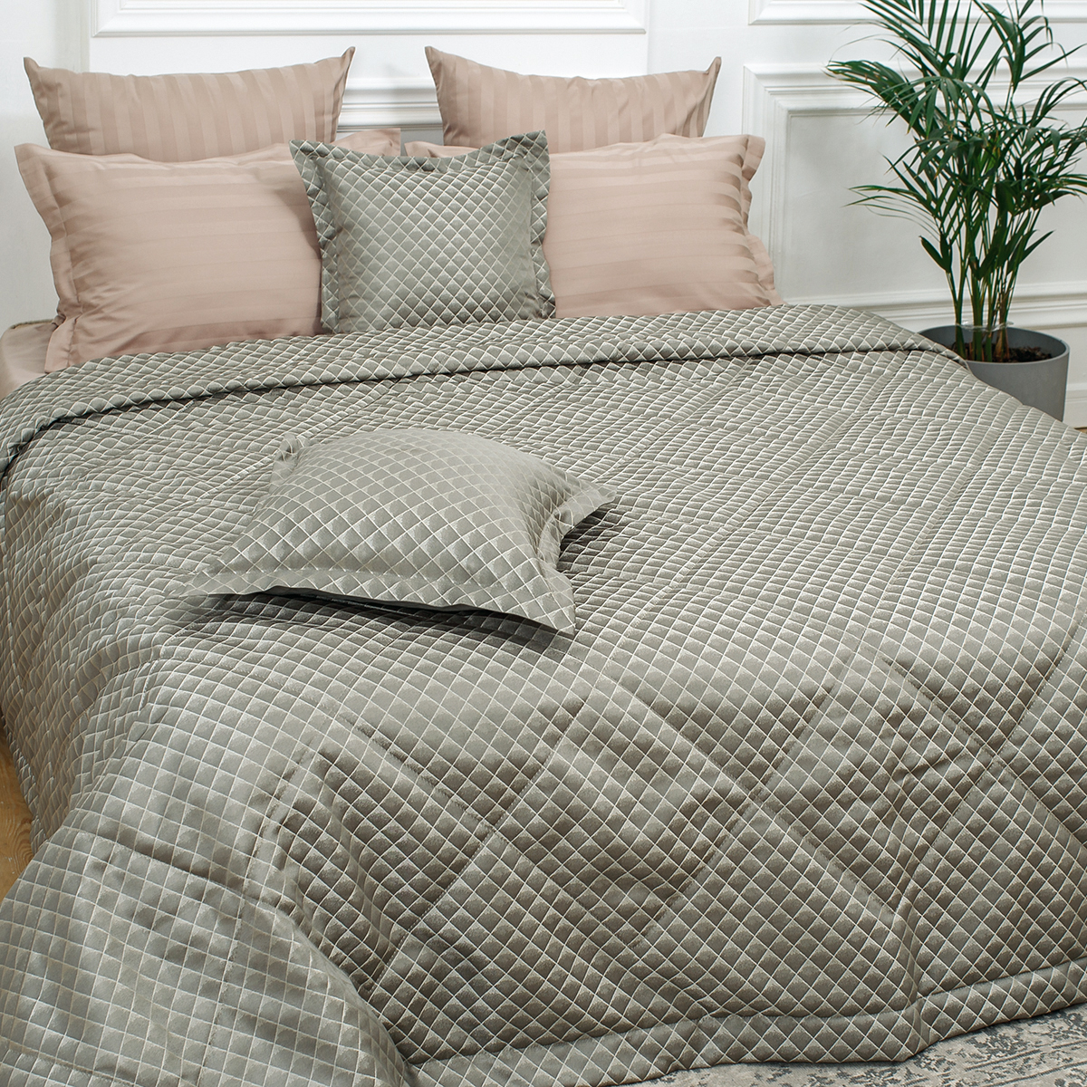 В комплект входит: стеганное покрывало на подкладе размер 240*260 см и 2 декоративные наволочки 45х45 см на молнии. Наволочки с четырех сторон декорированы ушками шириной 4 см.