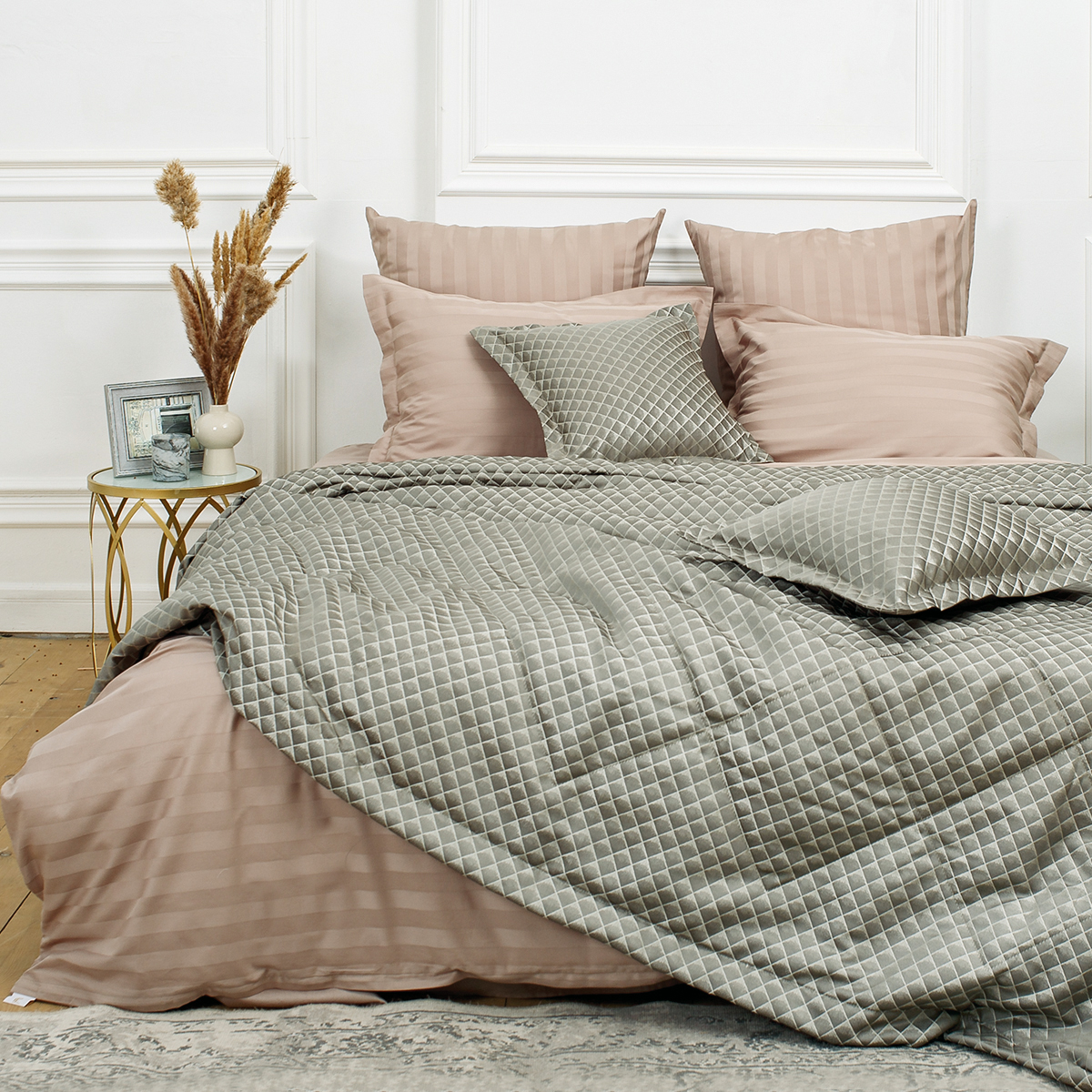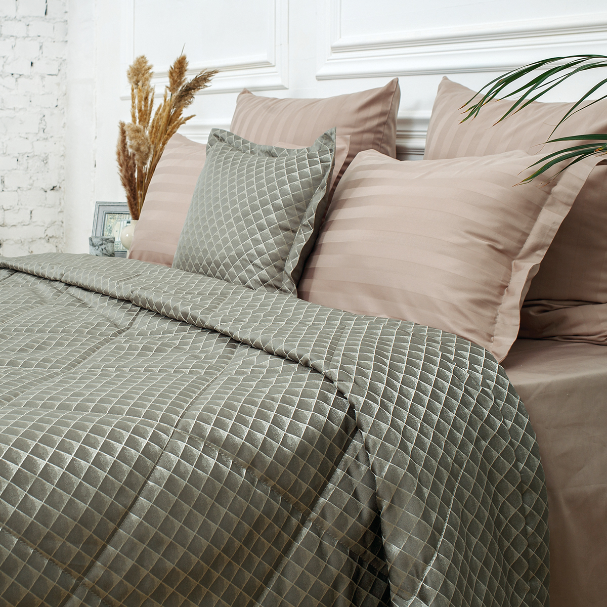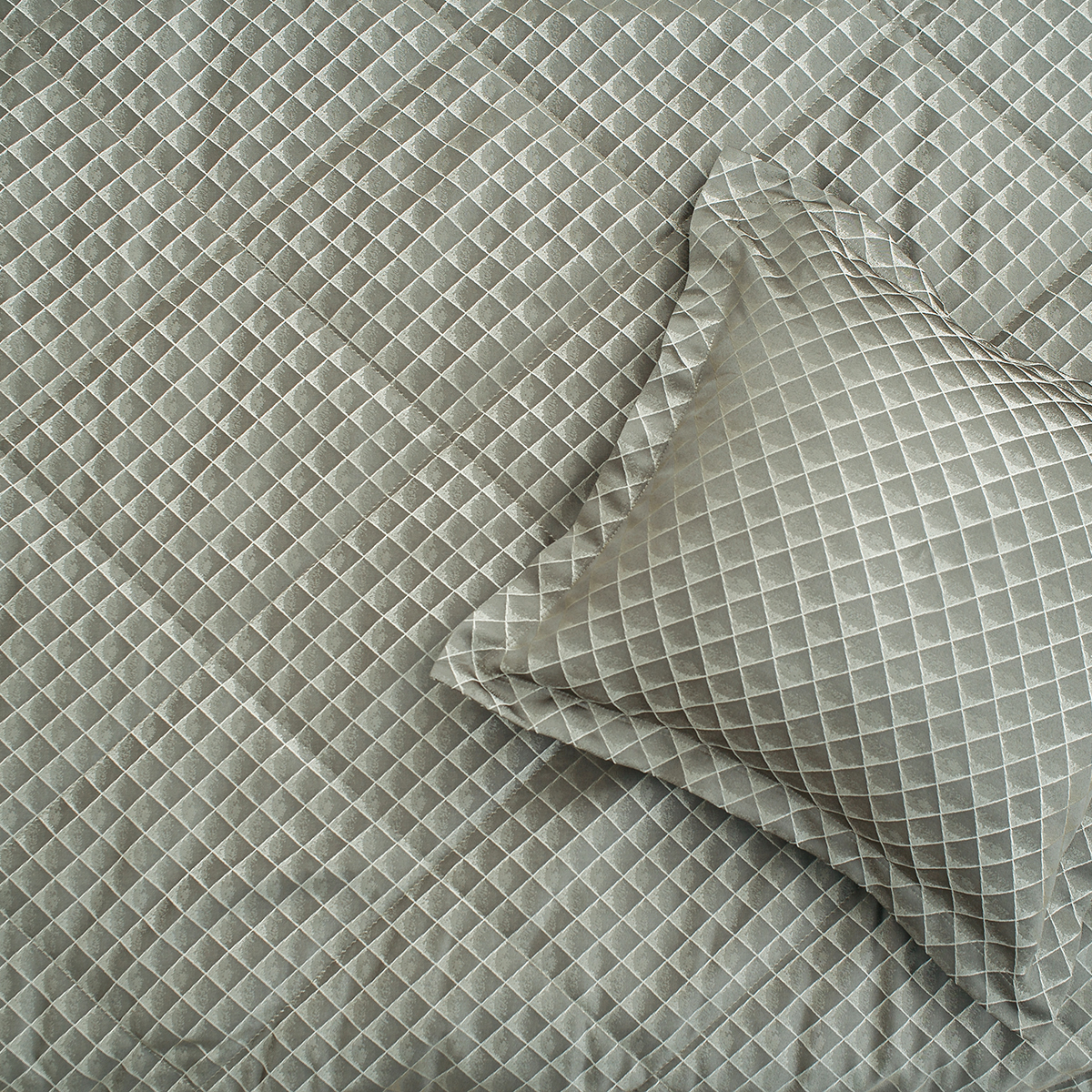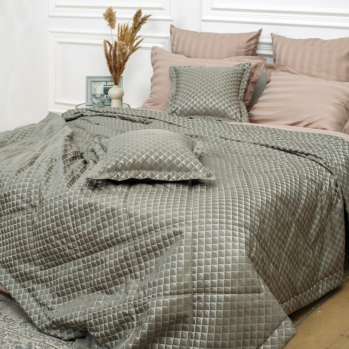 В комплект входит: стеганное покрывало на подкладе размер 240*260 см и 2 декоративные наволочки 45х45 см на молнии. Наволочки с четырех сторон декорированы ушками шириной 4 см.