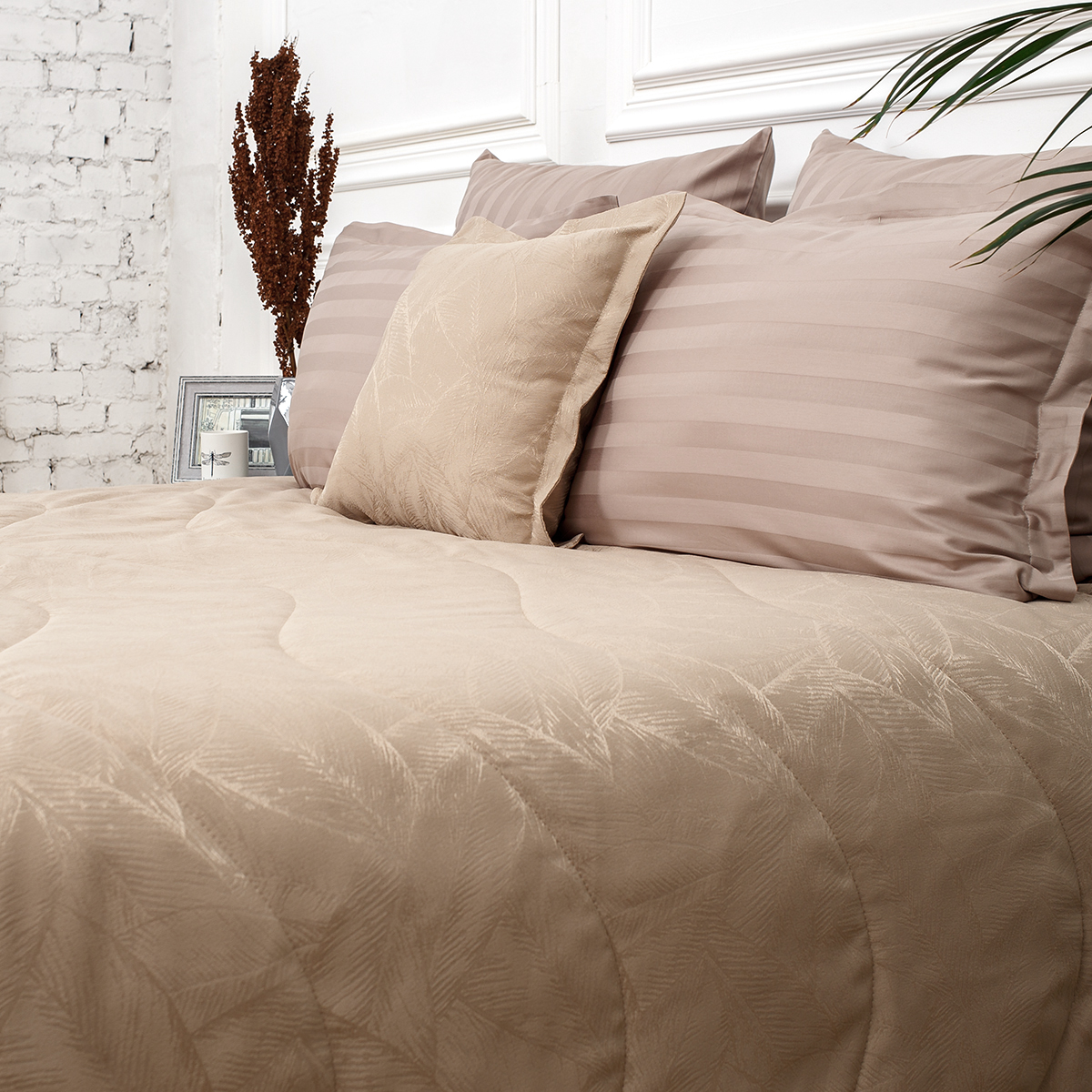 В комплект входит: стеганное покрывало на подкладе размер 240*260 см и 2 декоративные наволочки 45х45 см на молнии. Наволочки с четырех сторон декорированы ушками шириной 4 см.