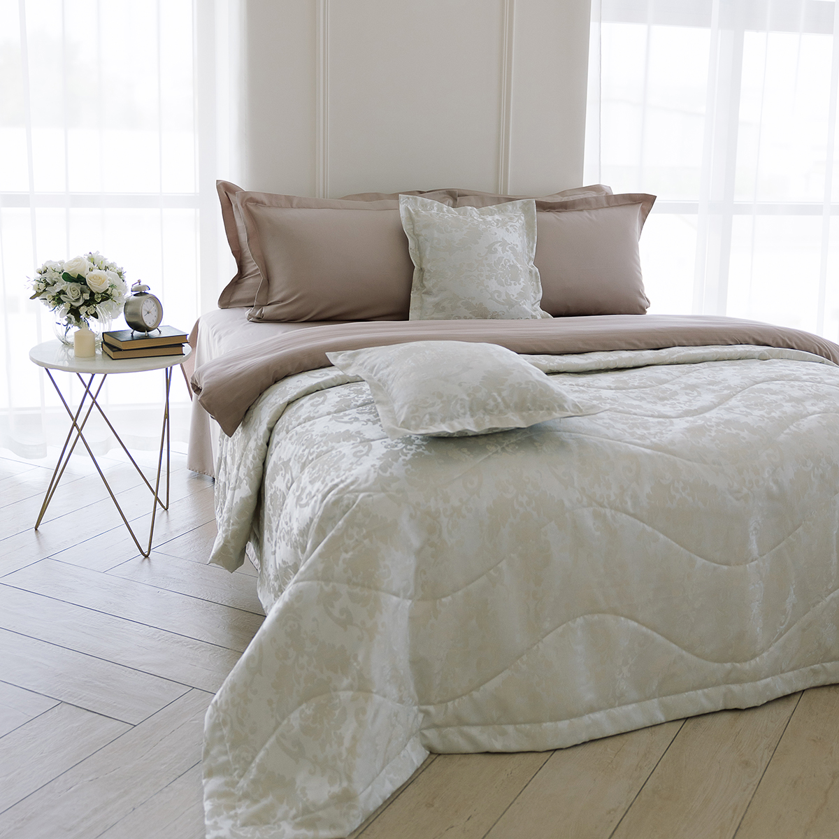 В комплект входит: стеганое покрывало на подкладе размер 240х260 см и 2 декоративные наволочки 45х45 см на молнии. Наволочки с четырех сторон декорированы ушками шириной 4 см.