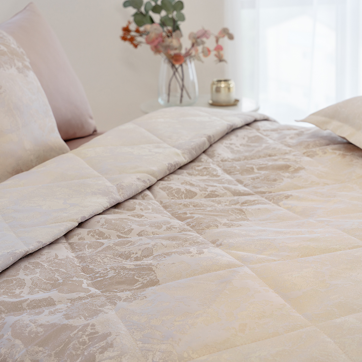 Состав: ткань портьерная 100% пэ, наполнитель - полиэфирное волокно. Стежка в виде ромбов. Подклад покрывала – микрофибра велюр, за счет своей фактуры он предотвращает скольжение покрывала на кровати.