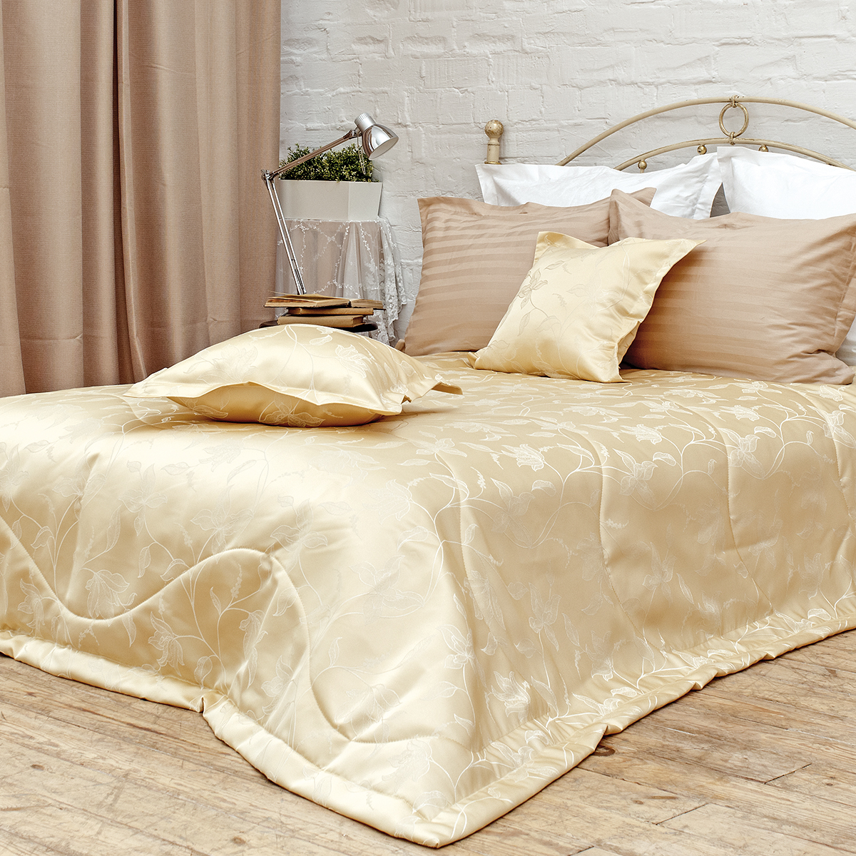 В комплект входит: стеганное покрывало на подкладе размер 240*260 см и 2 декоративные наволочки 45х45 см на молнии. Наволочки с четырех сторон декорированы ушками шириной 4 см.