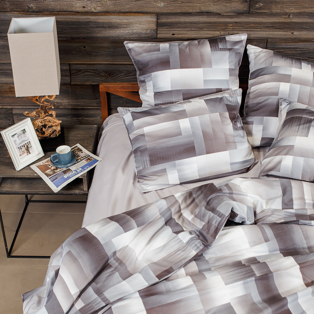 - Наволочки двухсторонние: лицевая сторона– геометрический принт, оборотная – однотонная. Декоративный кант по трем сторонам наволочки. Широкий запах на наволочках - легко менять подушки.
