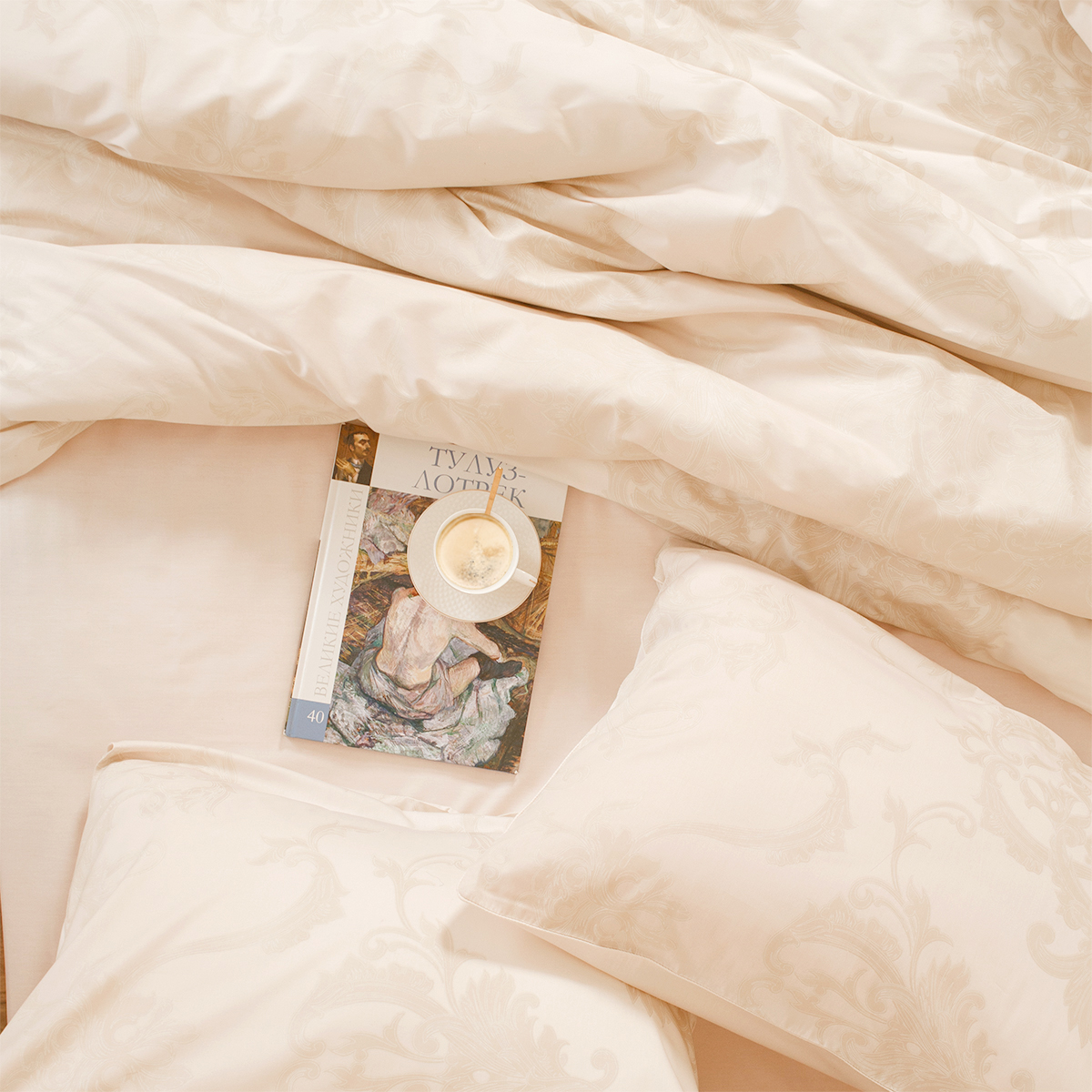 Элегантное созвучие классических форм – изысканные, тонко выписанные линии дамасского орнамента и мягкий пастельный фон. Особую изысканность комплекту придает роскошный градиентный переход от нежно-сливочного оттенка к более глубокому и насыщенному нюдово-песочному цвету.