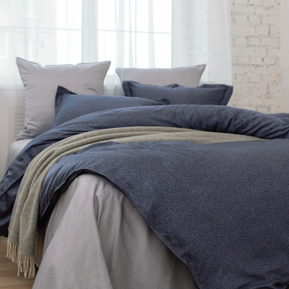Неповторимая глубина благородного синего оттенка в сочетании с универсальным серым - строгая и ультрамодная контрастность выгодно подчеркнет индивидуальность и украсит интерьер спальни.