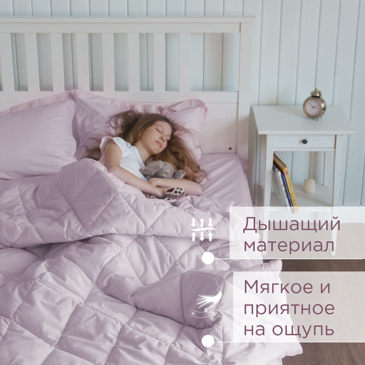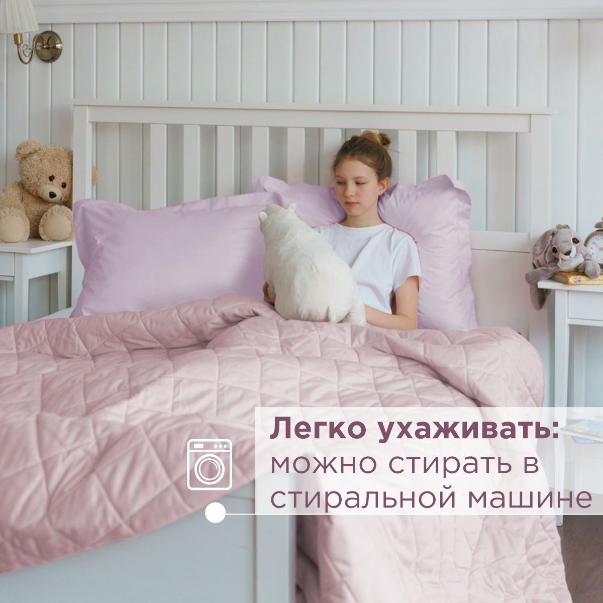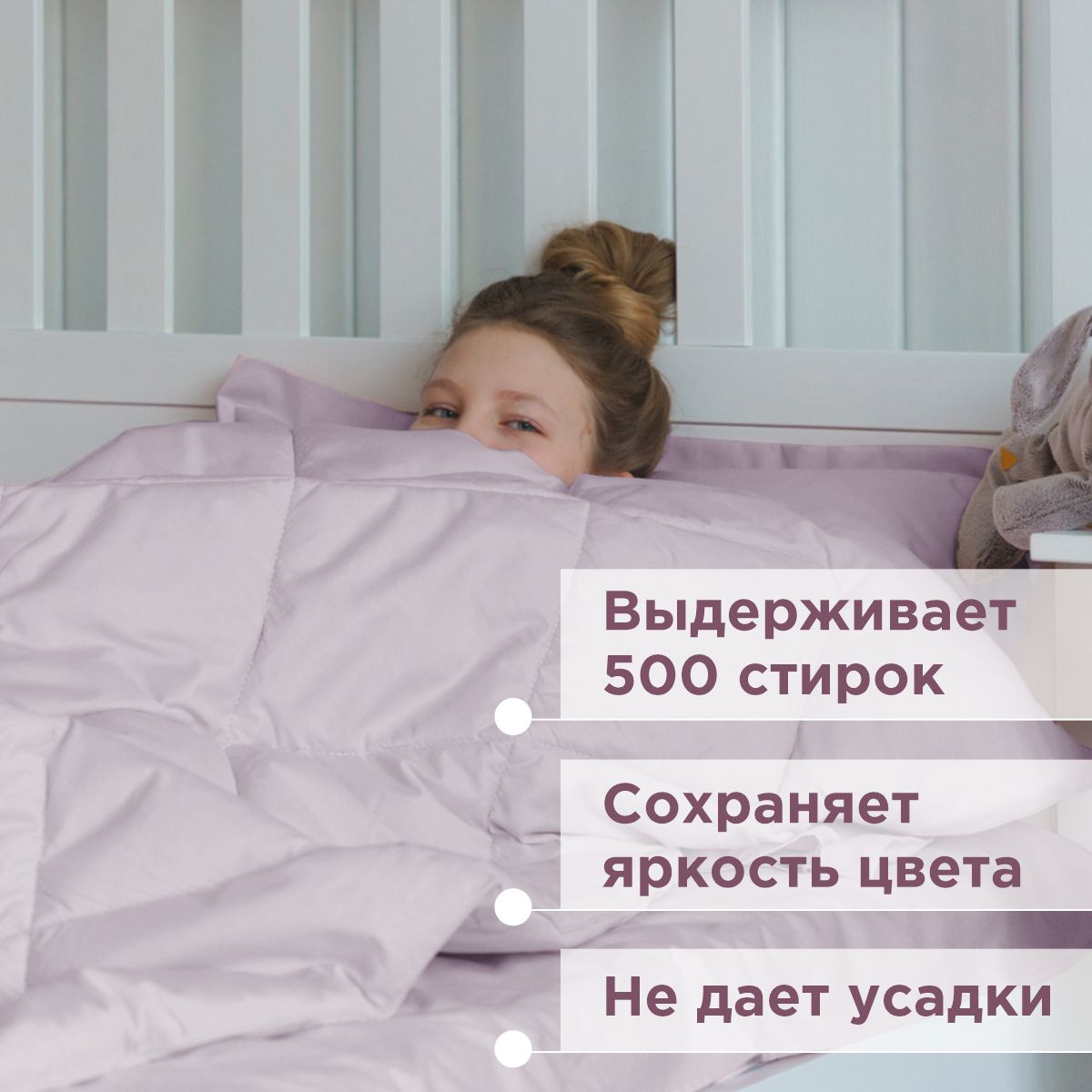За постельным бельем с одеялом легко ухаживать, его можно стирать в стиральной машине, оно выдерживает до 500 стирок.