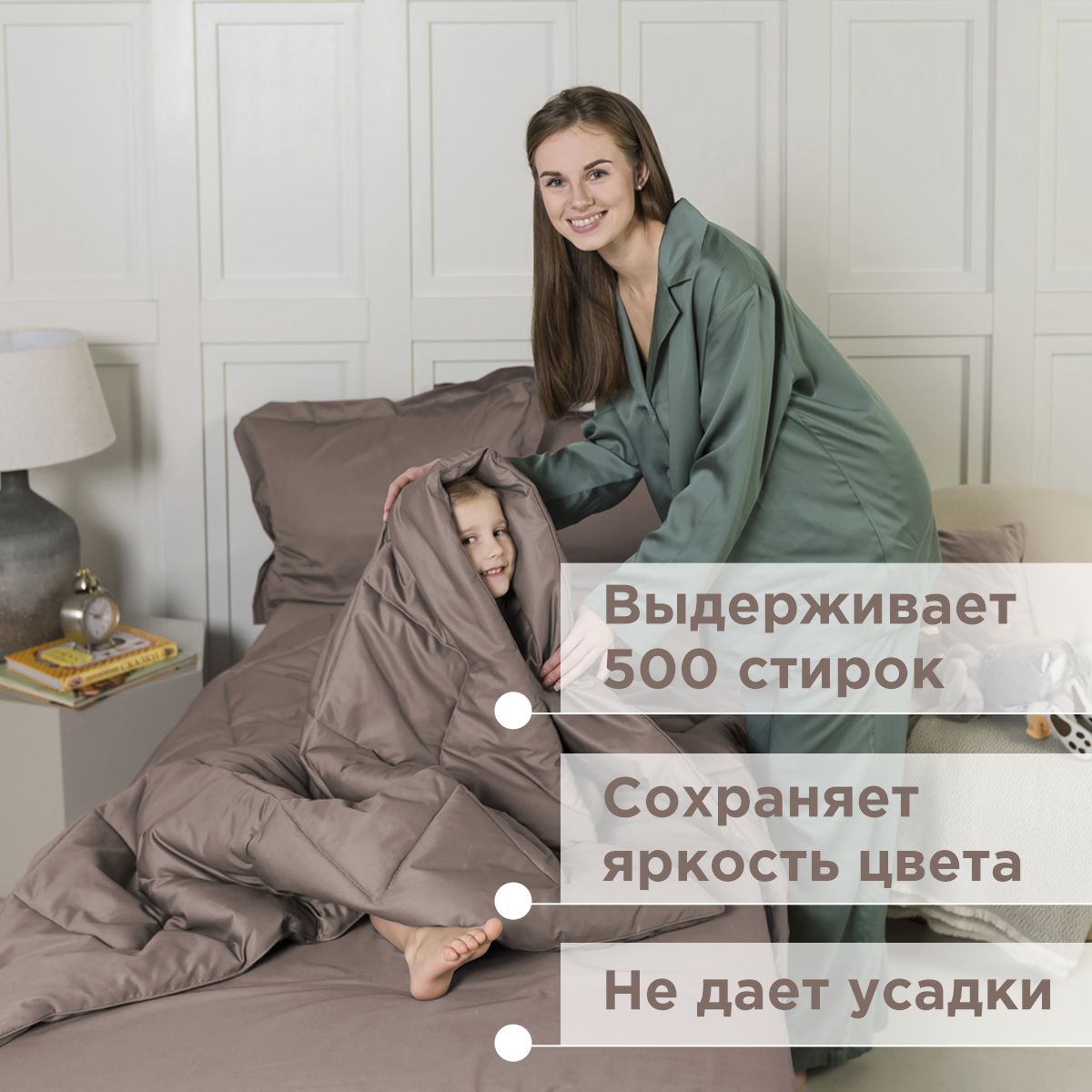 За постельным бельем с одеялом легко ухаживать, его можно стирать в стиральной машине, оно выдерживает до 500 стирок.