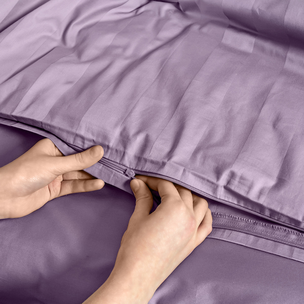 - «Невидимая» молния во всю ширину по нижнему краю пододеяльника. Для быстрой и удобной смены постельного белья в верхней части пододеяльника расположены клапаны для рук. Сменить пододеяльник можно за 30 секунд.