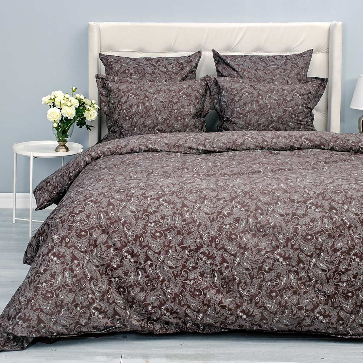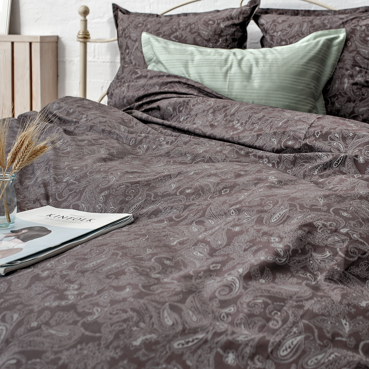 Комплект постельного белья выполнен из 100% хлопка, сатиновое переплетение, плотность ткани - 205 нитей/см2. Изюминка коллекции - орнаментальный рисунок Paisley. Наволочки с трех сторон декорированы ушками шириной 2,5 см.