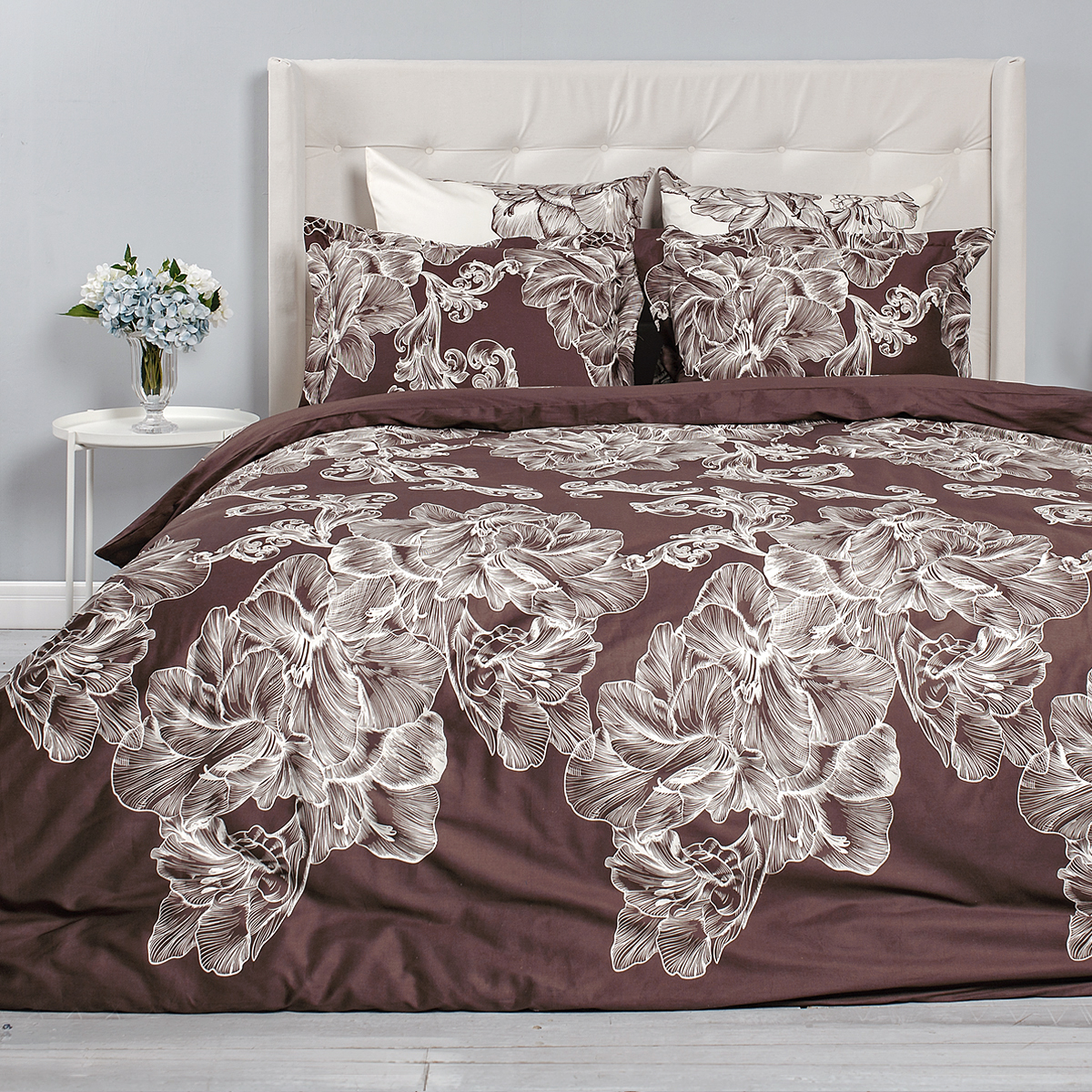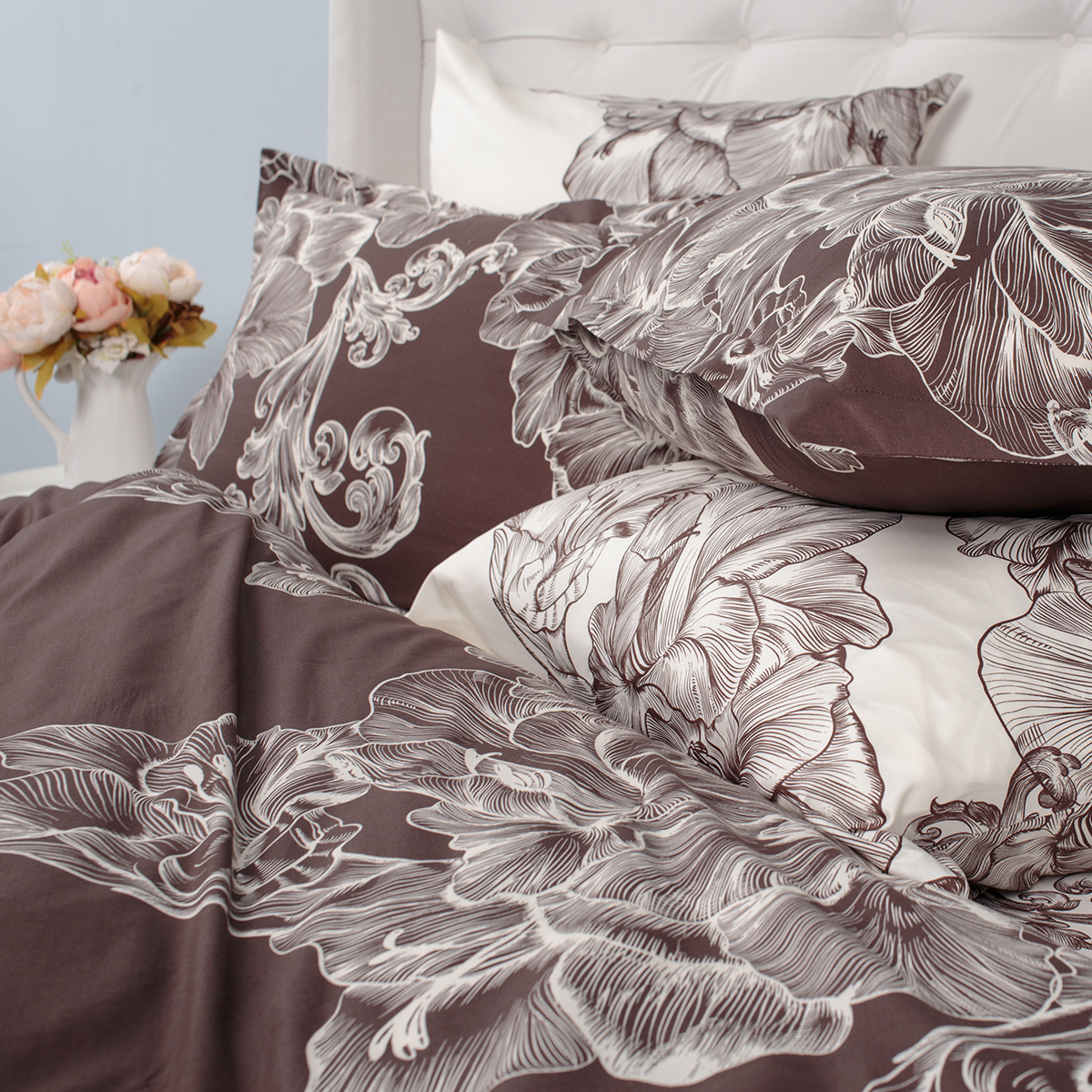Сочетание оттенков темного и молочного шоколада – истинное удовольствие для гурманов, с послевкусием оригинальных тоновых композиций. Цветочный ансамбль исполнен в модной гравюрной технике.