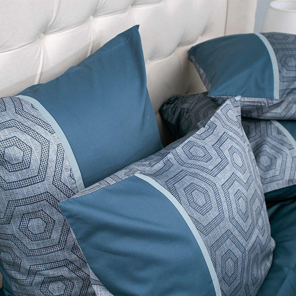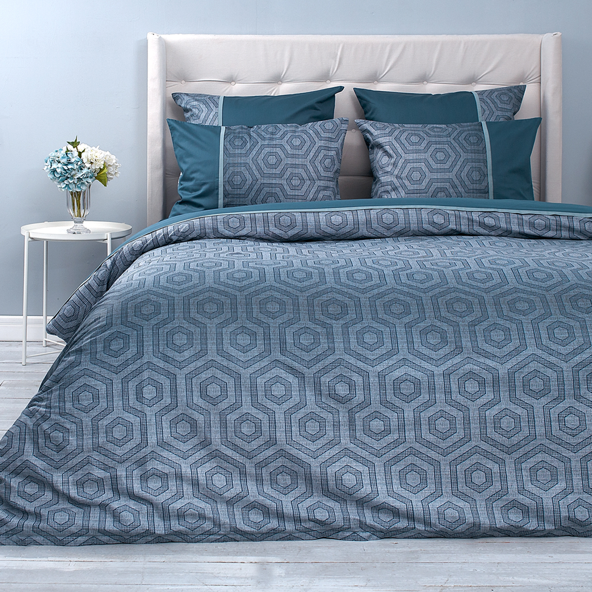 Смелый и дерзкий... Ультрамодная игра сочетаний: стильный геометрический орнамент, замысловатая архитектура ломанных линий и форм удачно подчеркивает стиль и лаконичность современного интерьера. Особую брутальность комплекту придают глубокие и насыщенные лазурно-изумрудные оттенки.