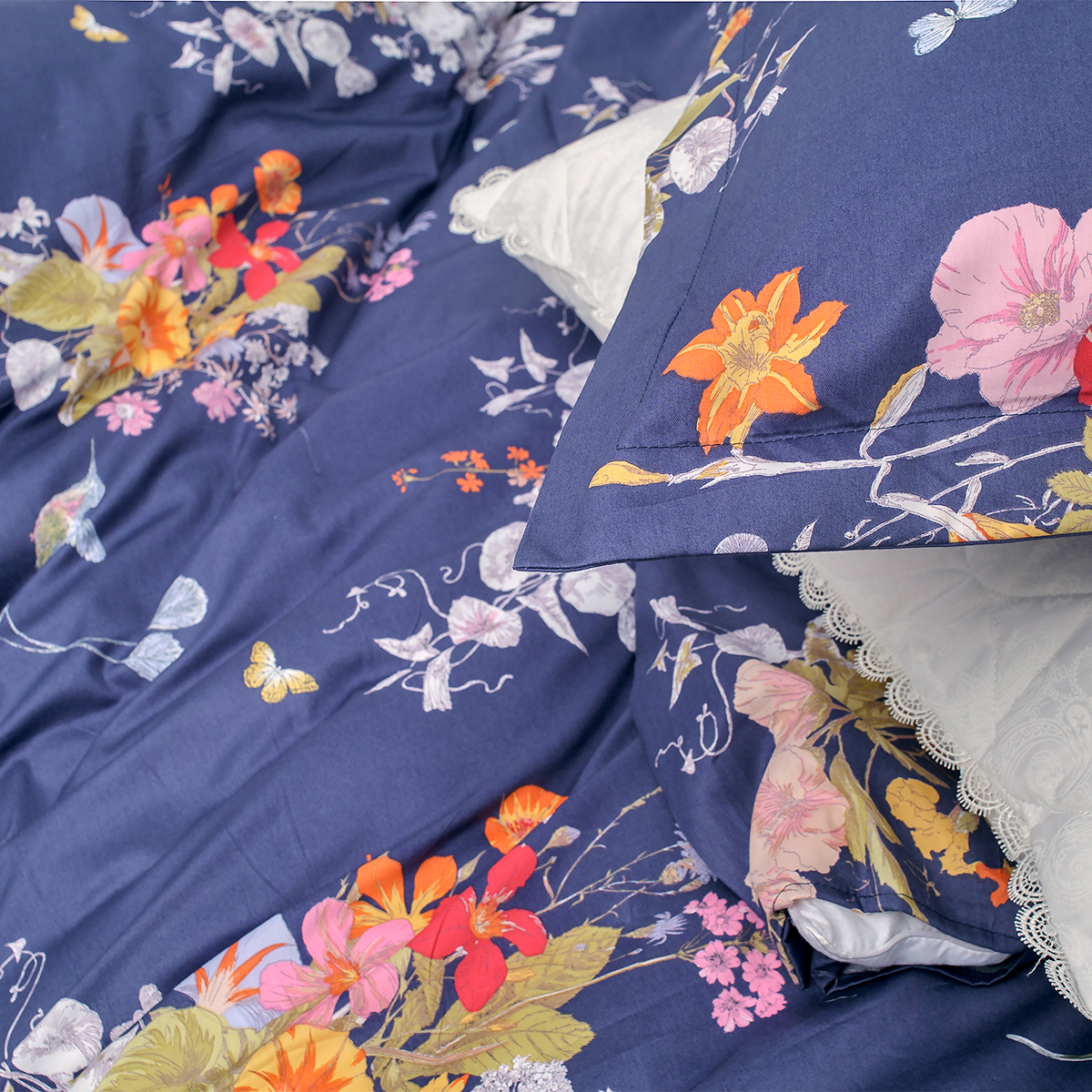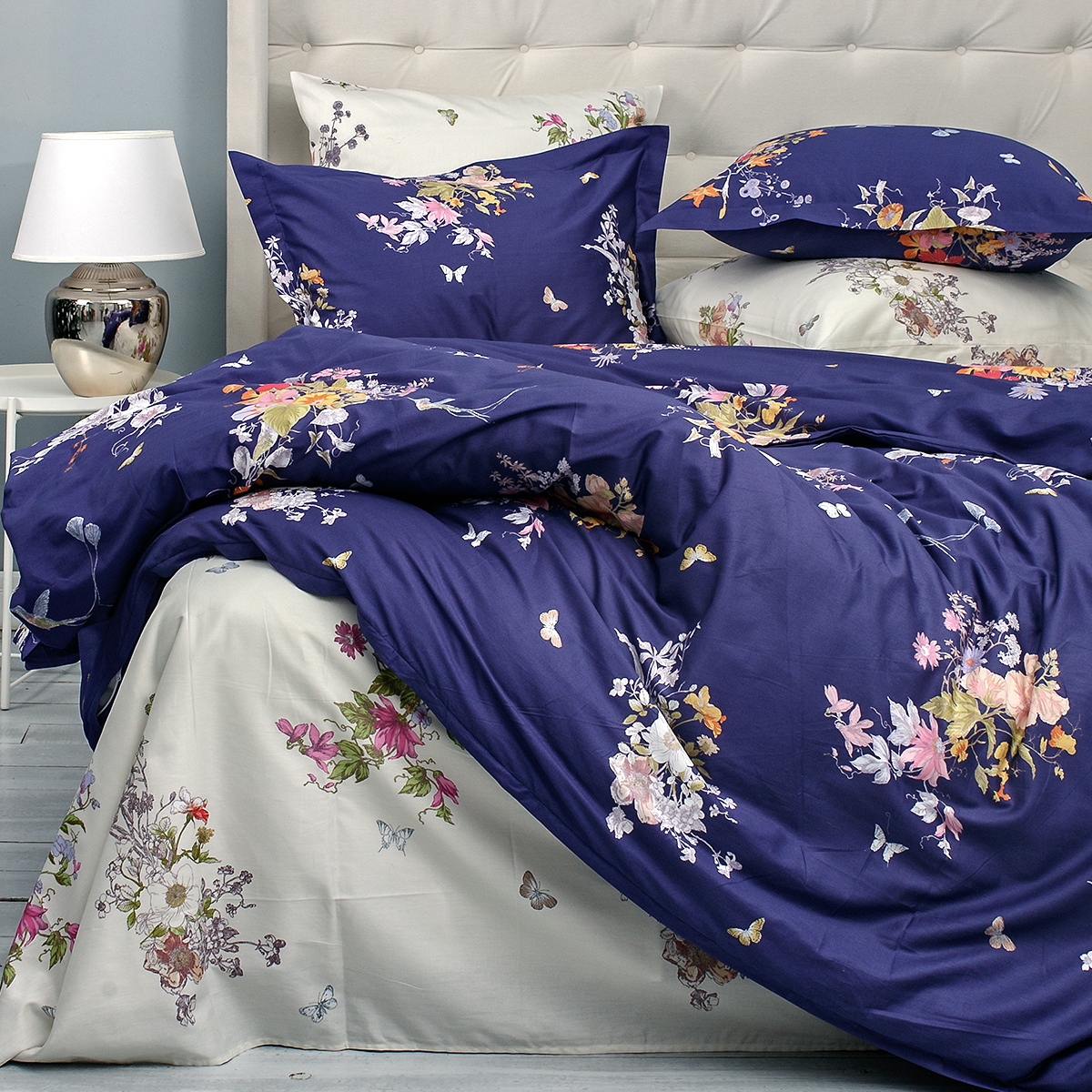 День-ночь, инь-ян - единство противоположностей и гармония цветовых сочетаний. Интригующий синий в созвучии с белым настраивает на философский лад. А нежные цветочные композиции с колибри и бабочками привносят легкость и фантазийность в дизайн постельного белья.
