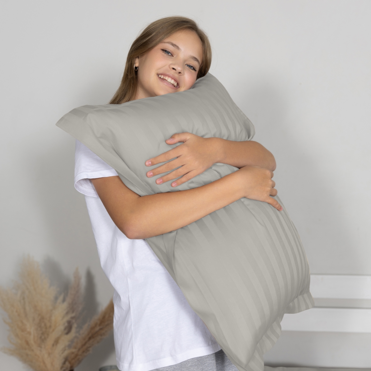 • Наволочки 50х70 см с ушками(из страйп-сатина) – 2 шт. для максимального комфорта и стильного оформления спальни. Клапан для вдевания подушки у наволочки находится по широкой стороне, поэтому сменить её сможет даже ребенок.