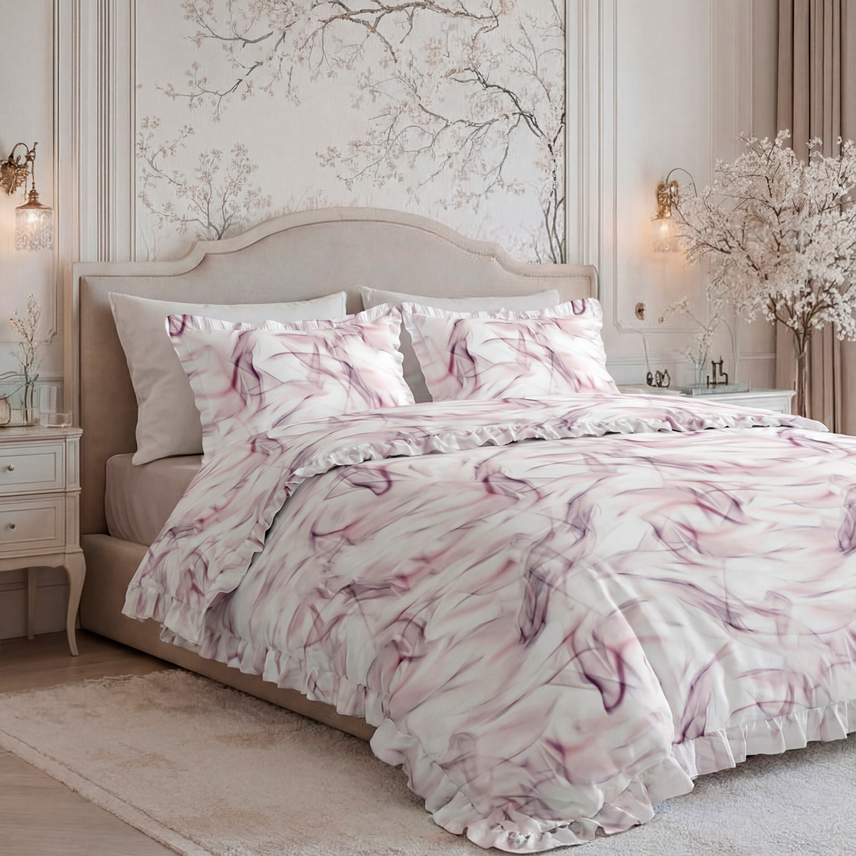 «Селеста»: Абстрактный розовый принт на белоснежном фоне. Легкий, невесомый, как облако на закате. Создает возвышенное, оптимистичное и нежное настроение.