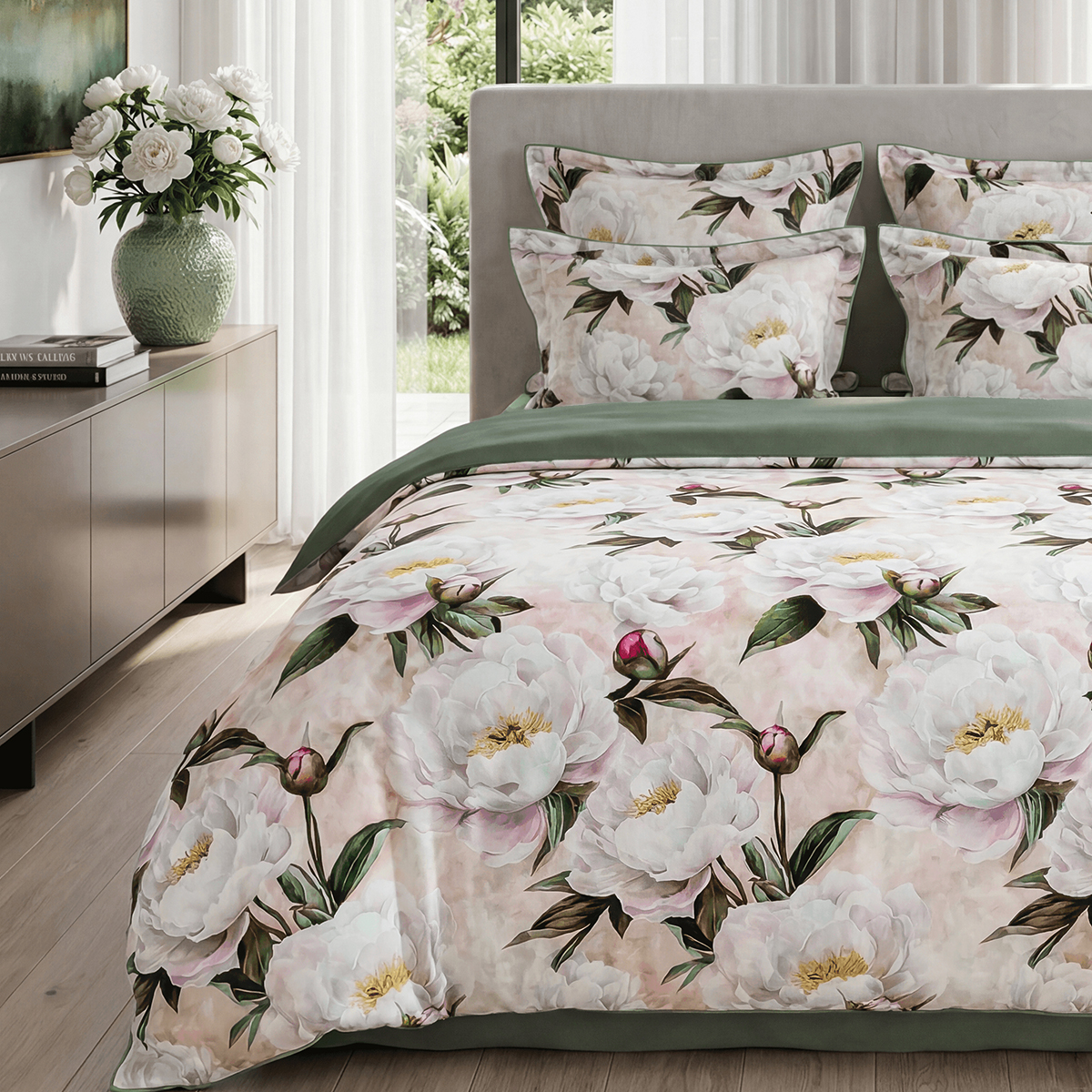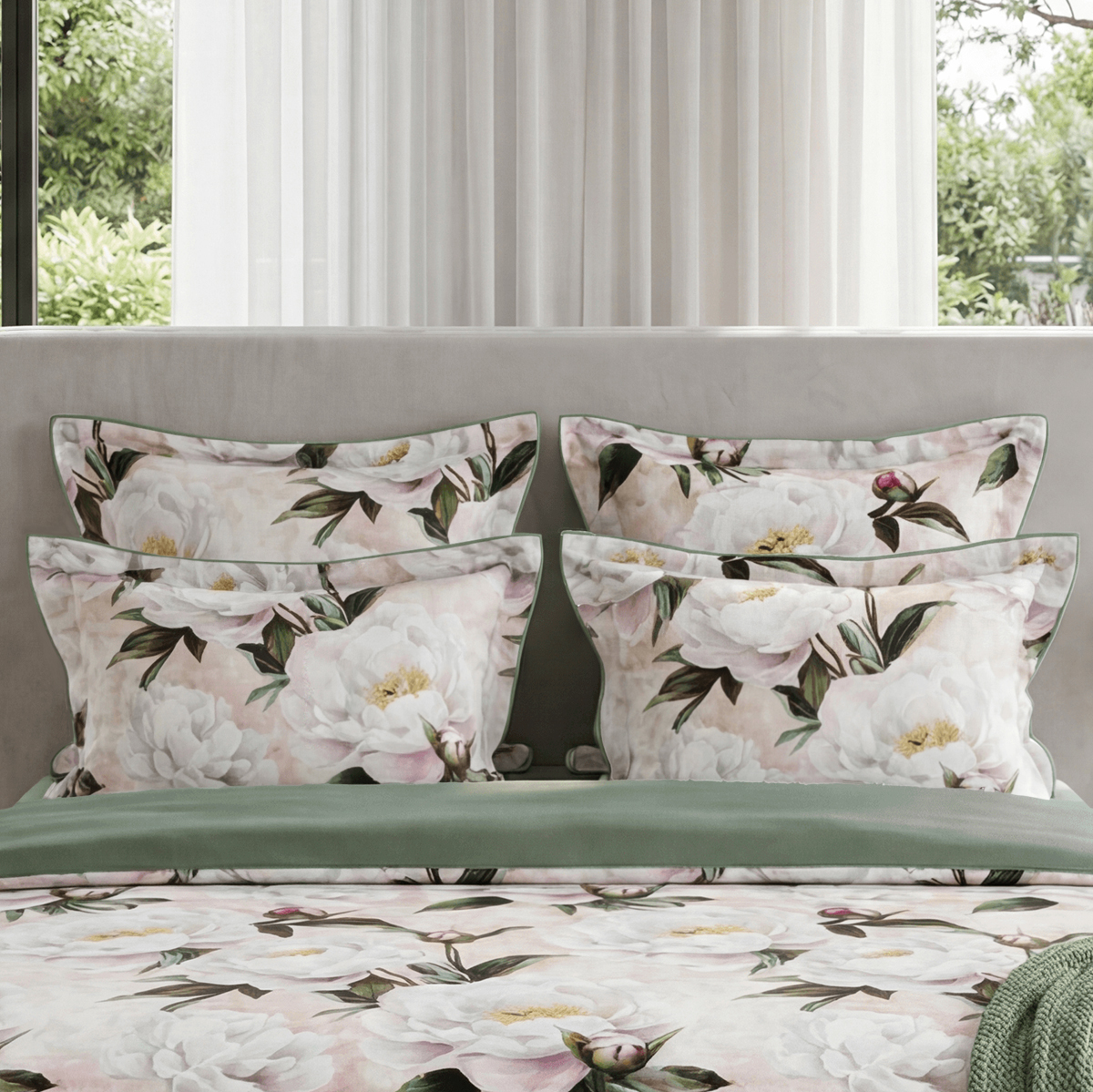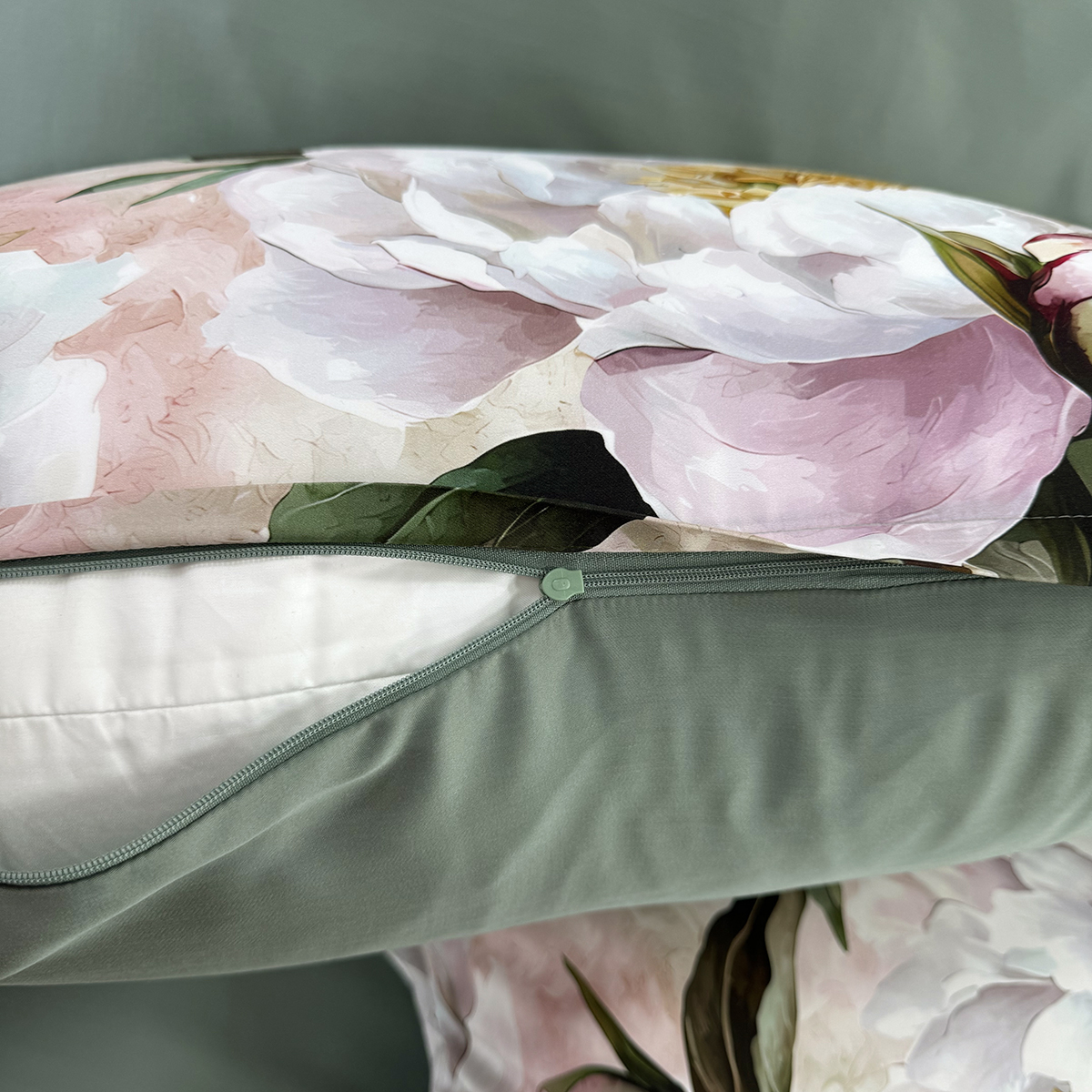 • Дизайн: Два настроения в одном комплекте. Лицевая сторона — крупные пионы на кремовом фоне, словно акварельный сон. Оборотная — глубокий зеленый цвет, создающий атмосферу умиротворения.