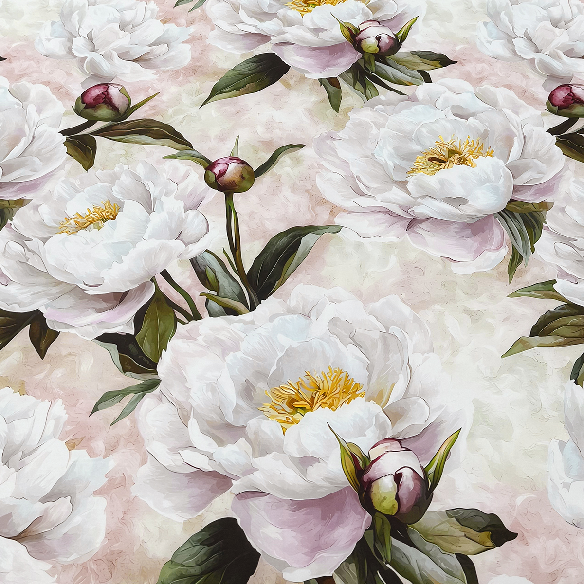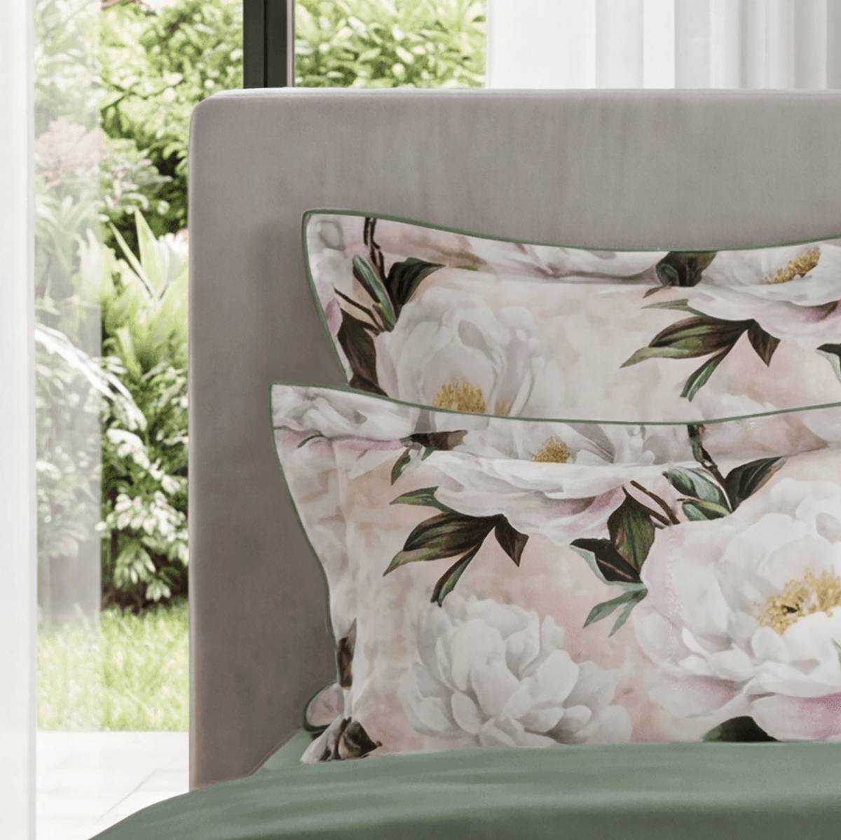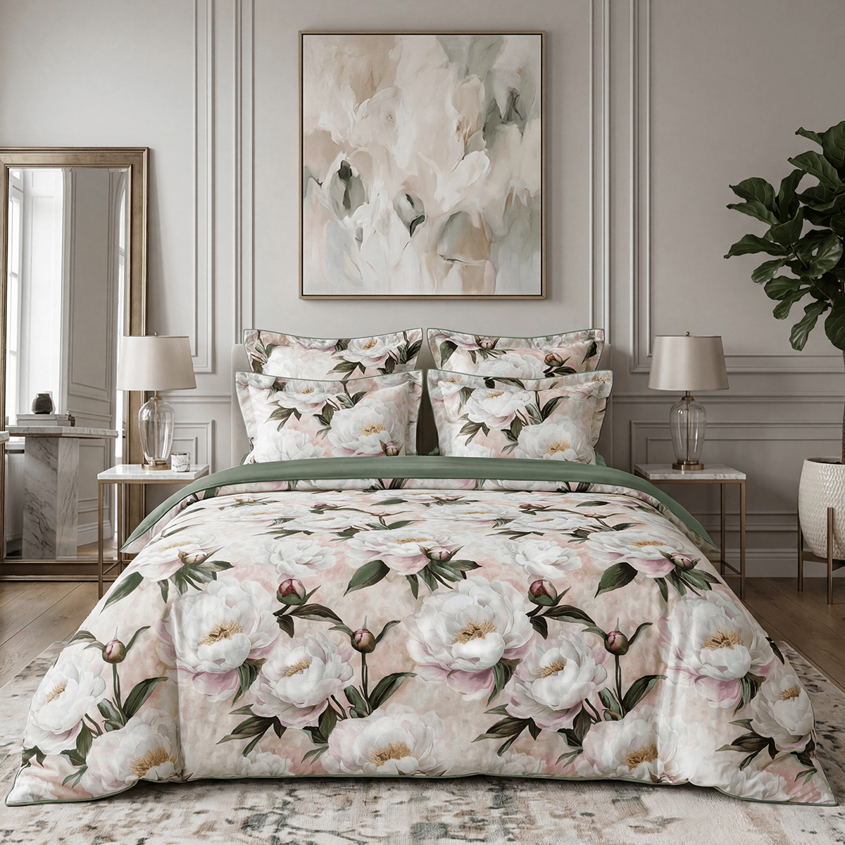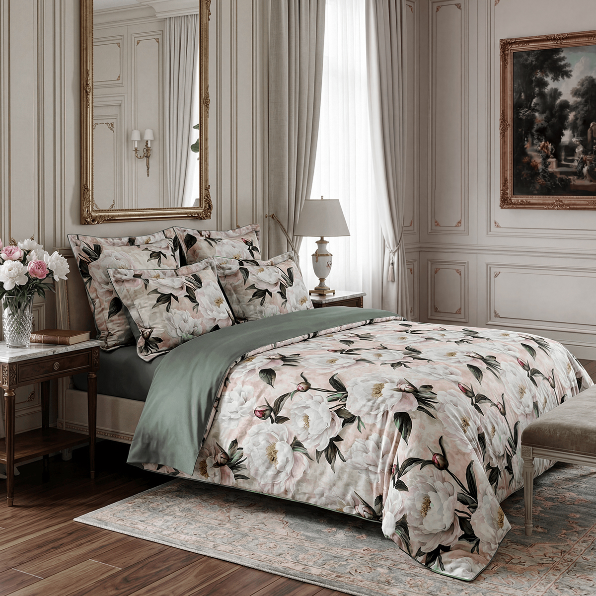 • Дизайн: Два настроения в одном комплекте. Лицевая сторона — крупные пионы на кремовом фоне, словно акварельный сон. Оборотная — глубокий зеленый цвет, создающий атмосферу умиротворения.