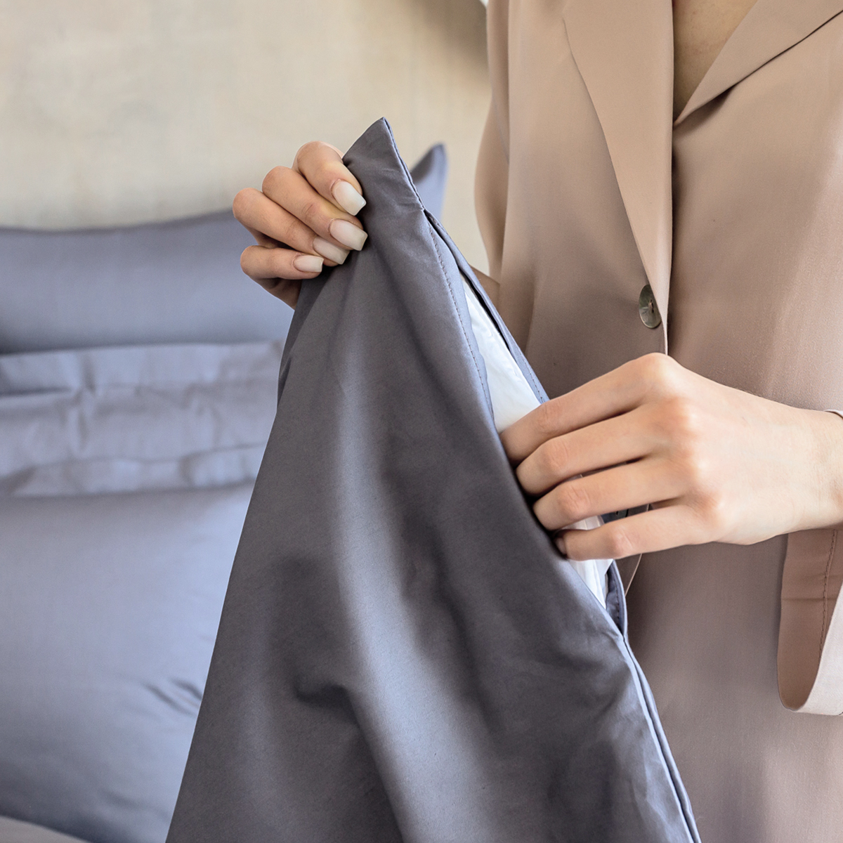 Детали: по нижнему краю во всю ширину пододеяльника вшита «невидимая» молния. Для быстрой и удобной смены постельного белья в верхней части пододеяльника расположены клапаны для рук. Вы продеваете руки в клапаны, снизу захватываете одеяло, встряхиваете и... вуаля: одеяло в пододеяльнике. Смена пододеяльника занимает всего 30 сек.