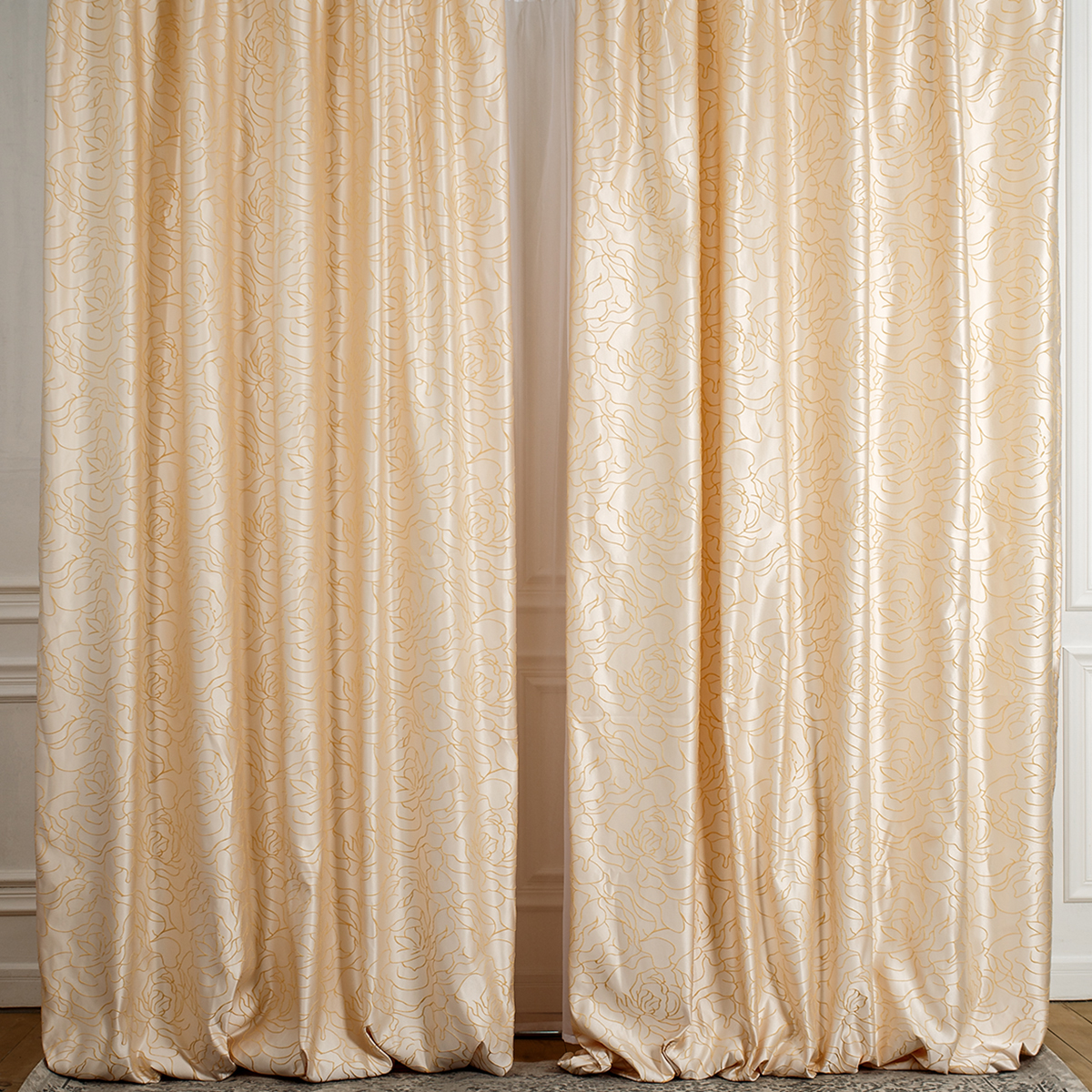 Готовые шторы отшиты на ленте – её можно стягивать и подстраивать под размер окна. Шторная лента, в свою очередь, является прекрасным помощником в создании объемной драпировки. Рекомендуемая длина карниза 250-300см. Низ штор обработан оверлоком для самостоятельного подгона изделия по высоте.