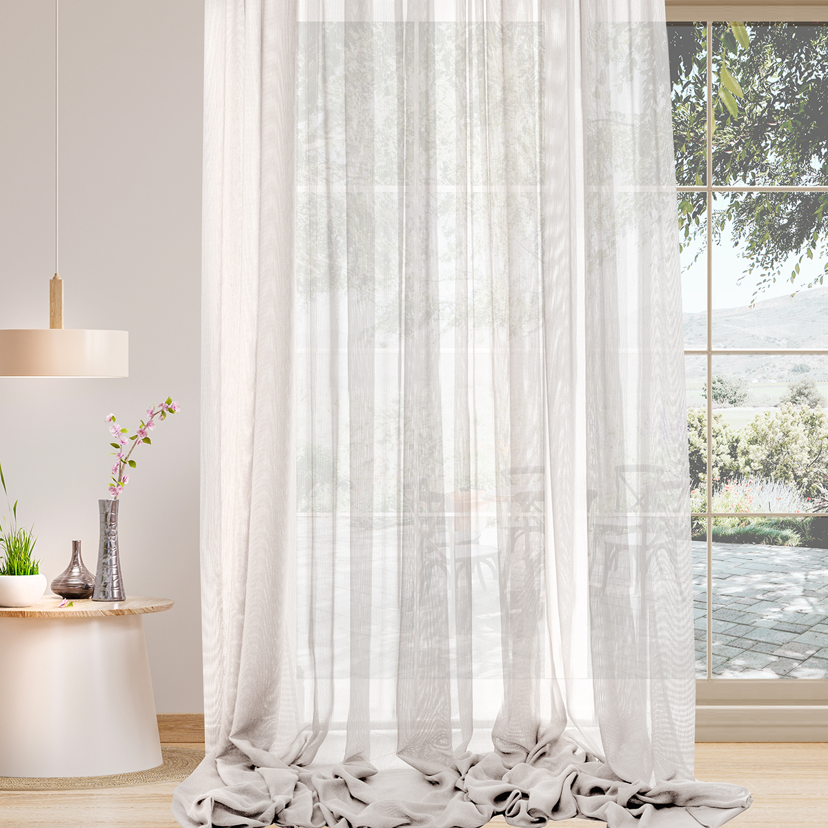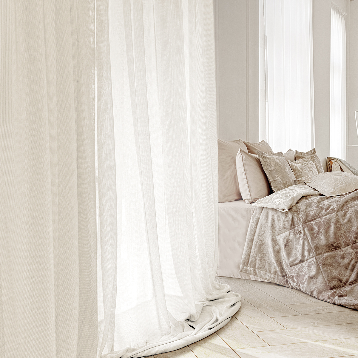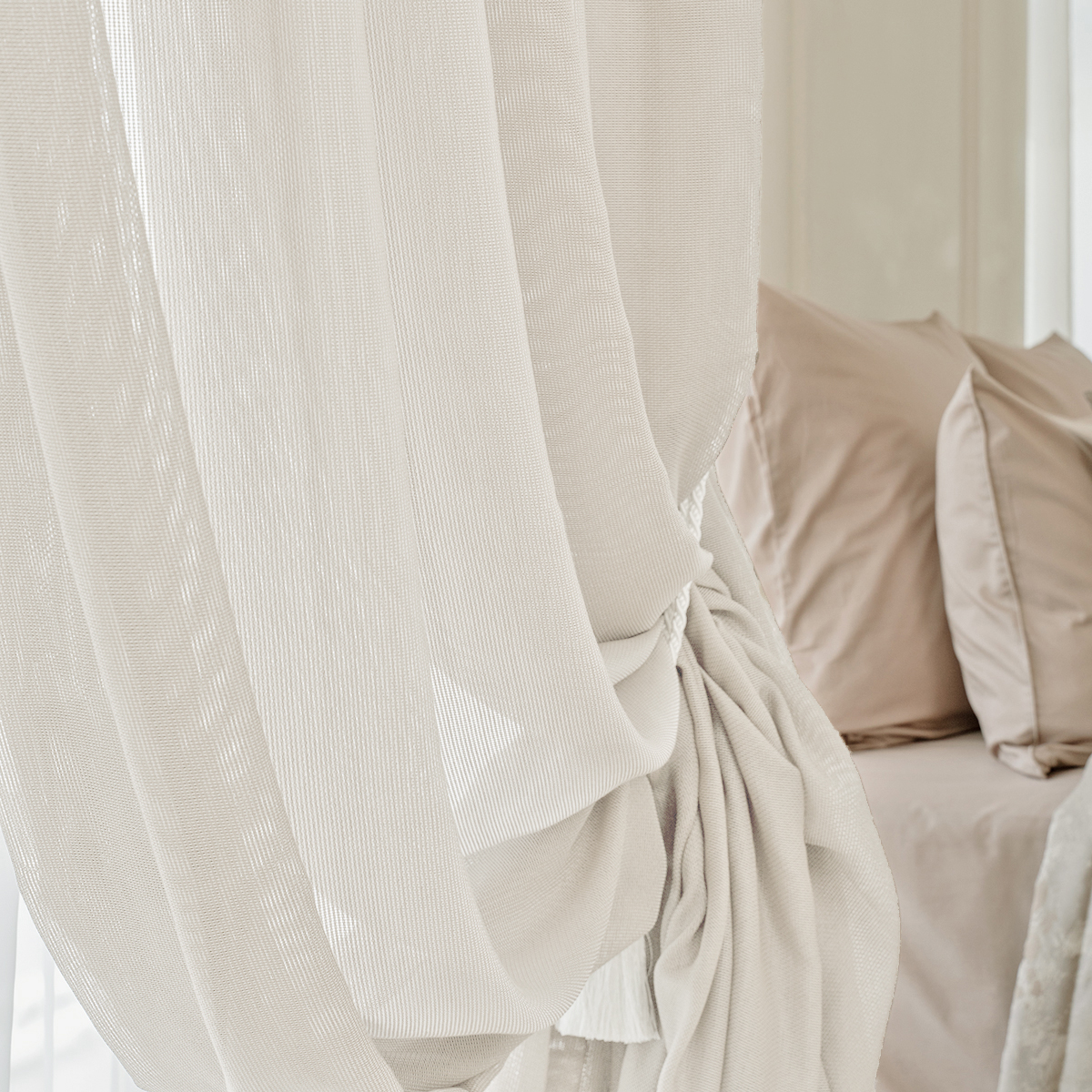 Легкая невесомая и в тоже время особо прочная, износостойкая ткань соткана в виде сетки. Натуральная фактура очень мягкая, приятная на ощупь. Прекрасно драпируется, может использоваться как самостоятельный декор окна.