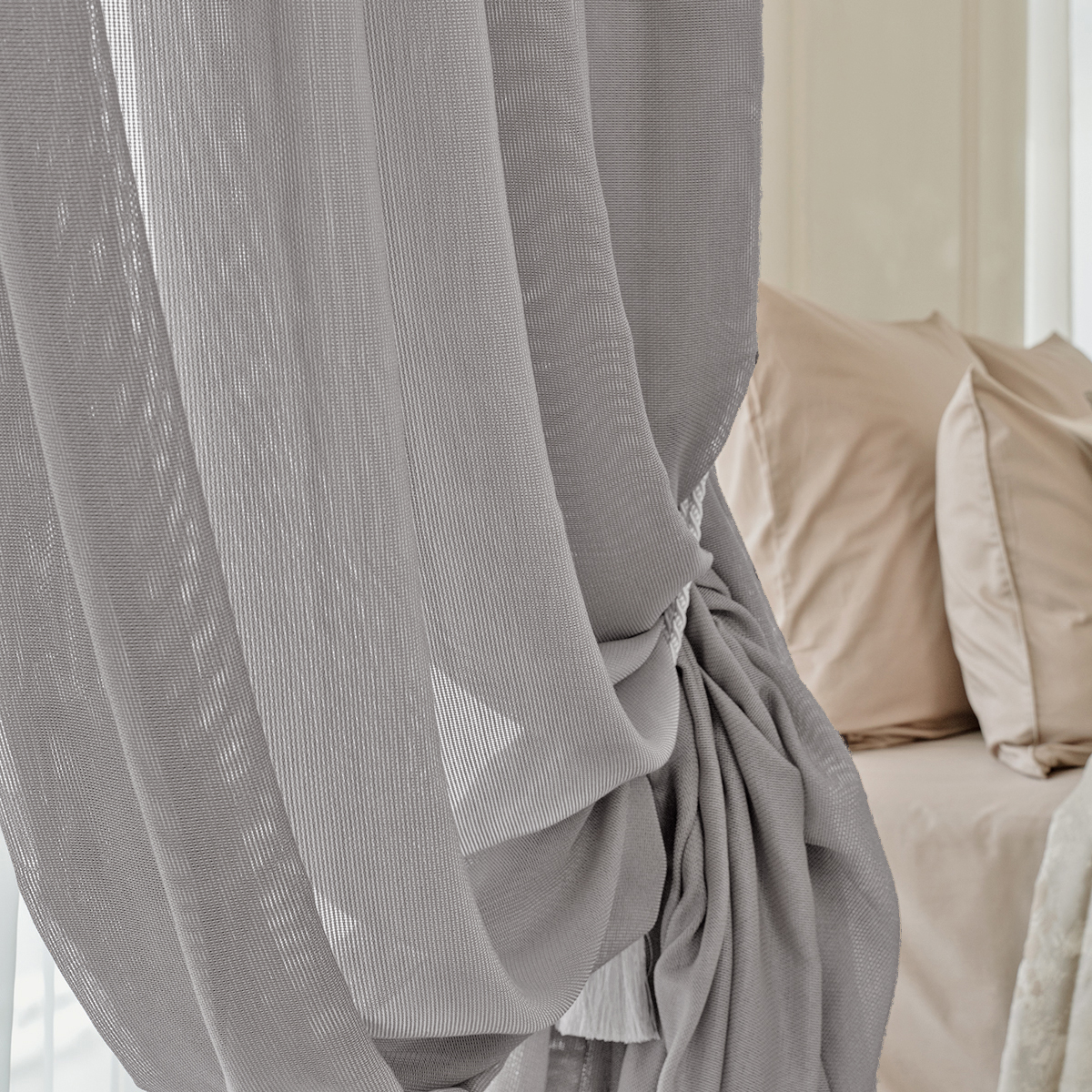 Легкая невесомая и в тоже время особо прочная, износостойкая ткань соткана в виде сетки. Натуральная фактура очень мягкая, приятная на ощупь. Прекрасно драпируется, может использоваться как самостоятельный декор окна.